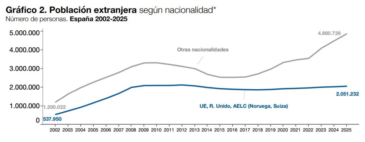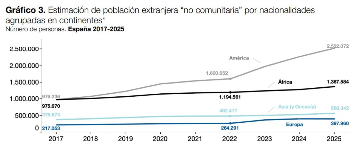 Al respecto, desde Funcas explican que "han sido las nacionalidades americanas las responsables del gran crecimiento de la población extranjera no comunitaria en los últimos ocho años, y, especialmente, desde 2022". Así, el think tank explica que, si en 2017 sumaban 1,6 millones de personas, en 2025 han pasado a ser 2,5 millones. En cambio, "el resto de las nacionalidades también han crecido, pero a un ritmo mucho menor". Por ello, de acuerdo con Funcas, "no extraña, entonces, que supongan, en 2025, el 91% de la población extranjera en situación administrativa irregular".