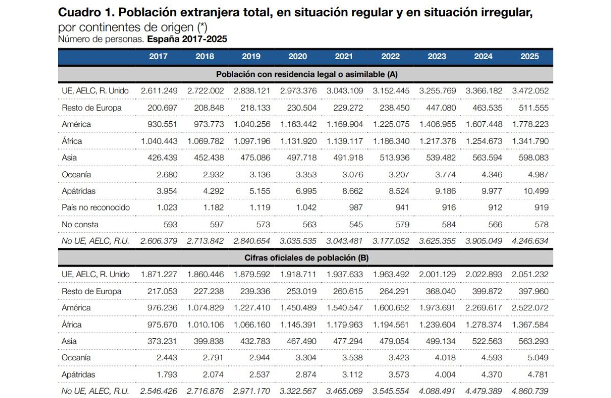 Como podemos comprobar, las cifras de población con residencia legal o asimilable recogen que en España había 3.472.052 europeos y británicos en 2025. Del mismo modo, había 1.778.223 procedentes de América y 1.341.790 africanos. En cambio, según las cifras oficiales de población, el año pasado en España vivieron 2.051.232 europeos y británicos, 2.522.072 americanos y 1.367.584 africanos.