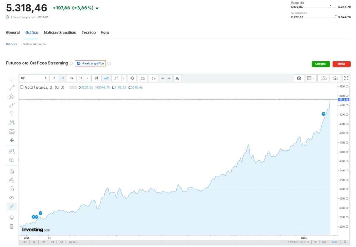 La incertidumbre en los mercados, las tensiones geopolíticas y las medidas erráticas del presidente de Estados Unidos, Donald Trump, sumadas a la debilidad de las divisas y la desconfianza de los inversores a futuro, están llevando al oro a registrar continuamente nuevos máximos históricos. Así, este miércoles hemos visto que el valor refugio por excelencia ha llegado a superar el umbral de los 5.300 dólares.