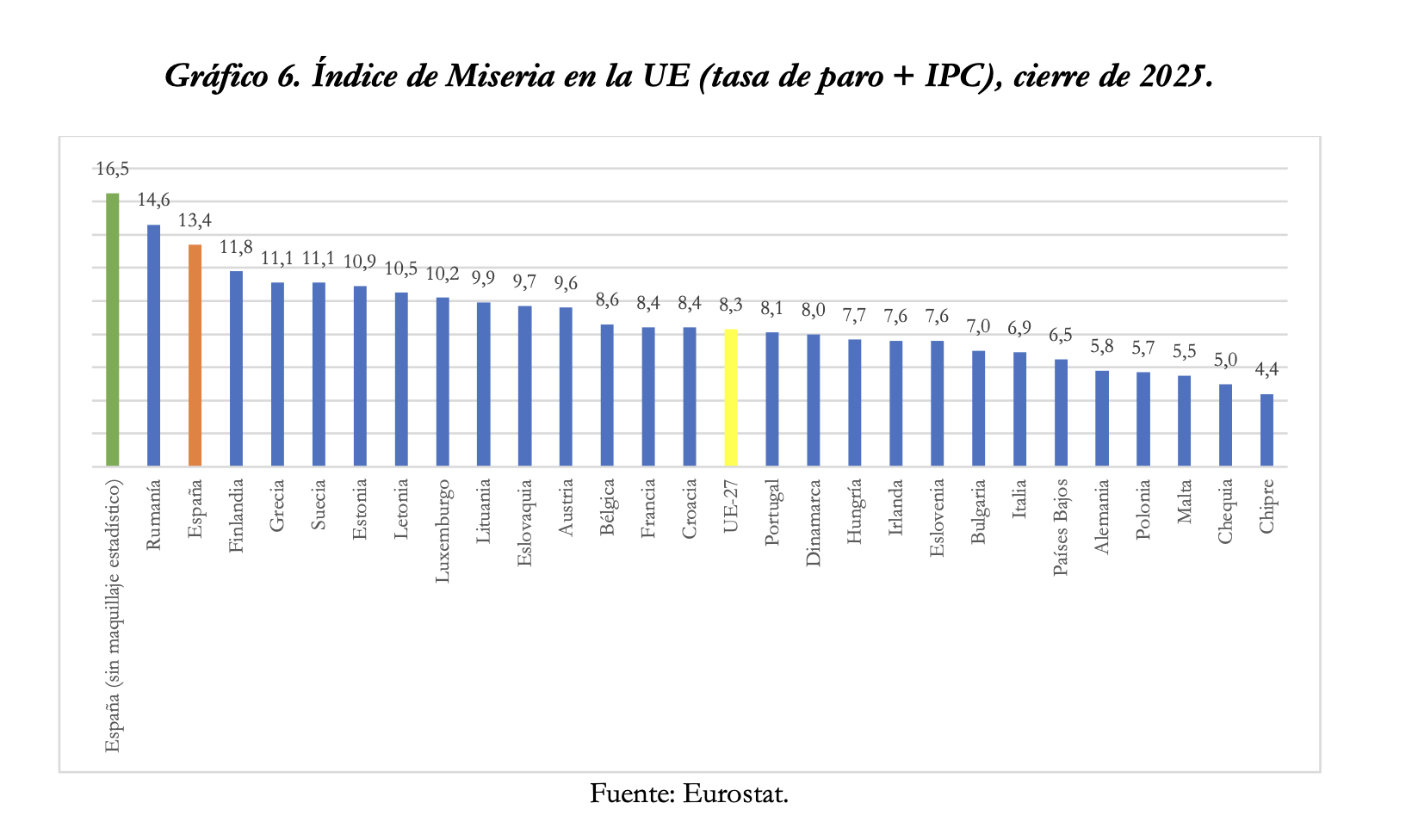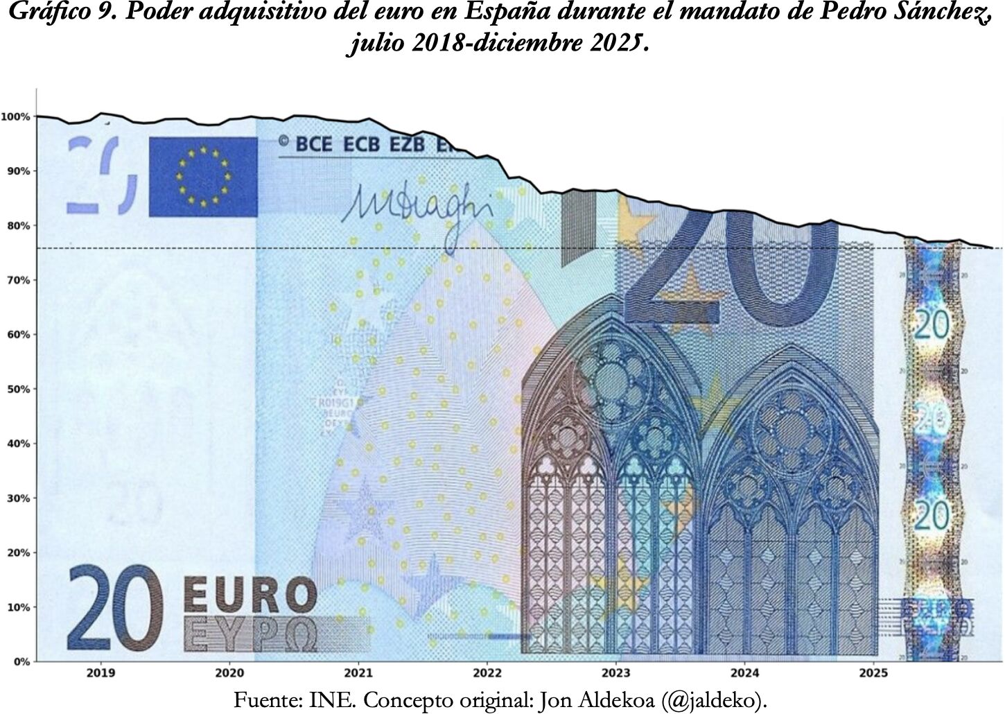 El IJM denuncia que "buena parte de esta pérdida de bienestar se explica por el efecto empobrecedor de un gasto público desbocado, que absorbe recursos, desplaza al sector privado y fomenta mercados más intervenidos y menos competitivos. A ello se suman políticas intervencionistas en ámbitos clave como la energía o la vivienda. El resultado es una economía cada vez más castigada por la inflación, con menor crecimiento y un deterioro sostenido del poder adquisitivo, en un contexto marcado por las decisiones de política económica del socialismo gobernante".