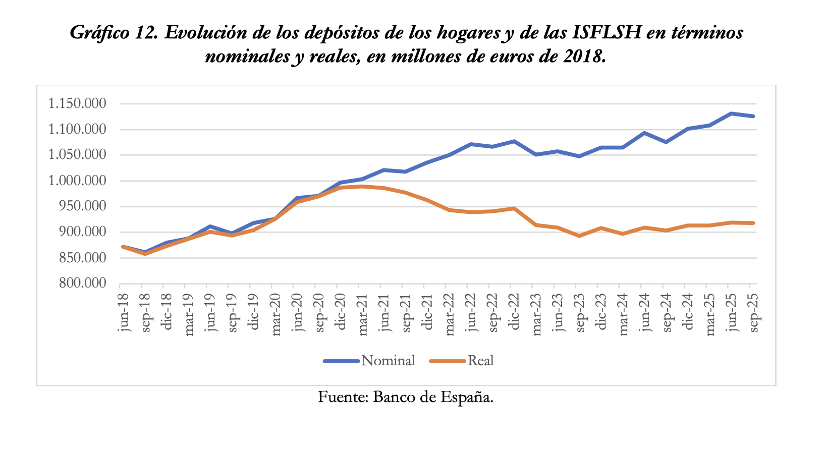 El impacto sobre el ahorro de las familias es igualmente severo. El documento del Instituto Juan de Mariana encuentra que, si bien el volumen nominal de los depósitos bancarios ha aumentado en 253.865 millones de euros desde mediados de 2018, su valor real apenas ha crecido en 45.931 millones. De hecho, desde 2022 el valor real de los depósitos ha caído en 28.500 millones, lo que supone una fuerte erosión del poder de compra del dinero ahorrado.