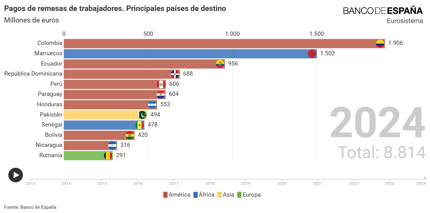 Concretamente, Colombia fue el primer país de destino de las remesas en el año 2024, con un total de 1.906 millones. Por su parte, Marruecos fue el segundo país al que llegaron más remesas procedentes desde España, sumando 1.502 millones al término del año. Del mismo modo, Ecuador recibió 956 millones de euros por parte de trabajadores en España. Asimismo, a República Dominicana llegaron 688 millones en forma de remesas y Perú recibió 606 millones.