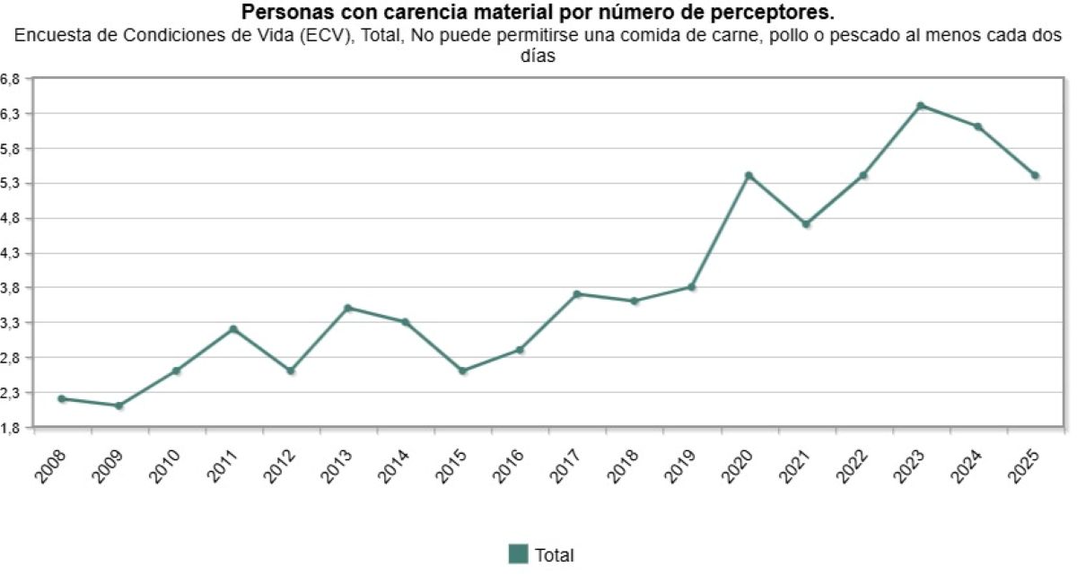No obstante, resulta especialmente llamativo la cantidad de españoles que tiene que reducir su consumo de productos básicos. Como podemos comprobar a continuación, el porcentaje de personas que no puede permitirse una comida de carne, pollo o pescado al menos cada dos días se ha disparado desde el 3,6% de 2018 al 5,4% en 2025. Dicho de otro modo: las personas que no pueden permitirse comer estos productos de forma habitual han crecido un 50% desde que gobierna Sánchez.