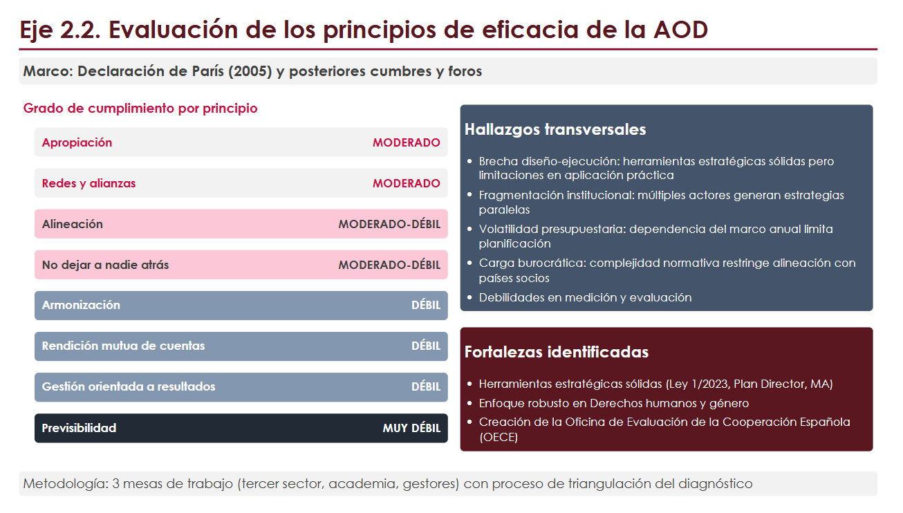 La AIReF, en base a los propios principios de eficacia de la Ayuda Oficial al Desarrollo (AOD) establecidos en la Declaración de París del 2005, concluye lo siguiente:
