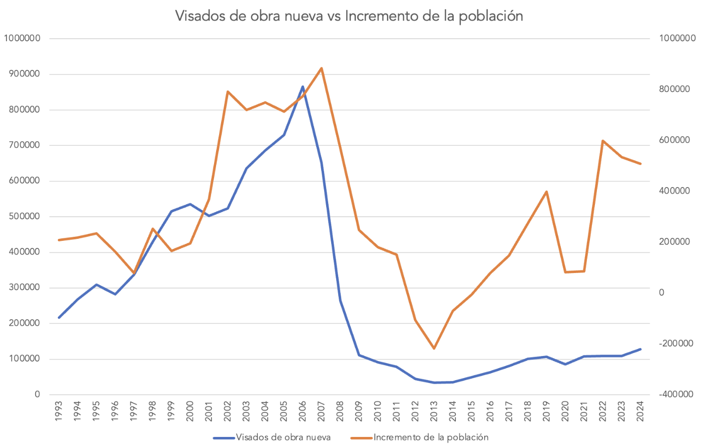 Año tras año, la diferencia entre la obra nueva que se desarrolla y el aumento en el número de residentes ha revelado ser un patrón sostenido. En 2018 se levantaron 100.733 casas frente a 273.881 nuevos residentes, mientras que en 2019 el saldo fue de 106.266 visados y 399.099 nuevos habitantes. En 2020, a raíz de la pandemia, se finalizaron 85.535 pisos y casas, mientras que la demografía se incrementó en 82.748 personas, mientras que en 2021 los datos fueron de 108.318 visados y 85.929 habitantes más. Sin embargo, la tendencia volvió a afianzarse en 2022 (108.923 visados vs 598.634 nuevos residentes) y se mantuvo en 2023 (109.483 visados vs 534.334 habitantes más). Para 2024, el dato final fue de 127.772 permisos de construcción de obra nueva que se contrastan negativamente con una subida de 508.602 en el padrón nacional.