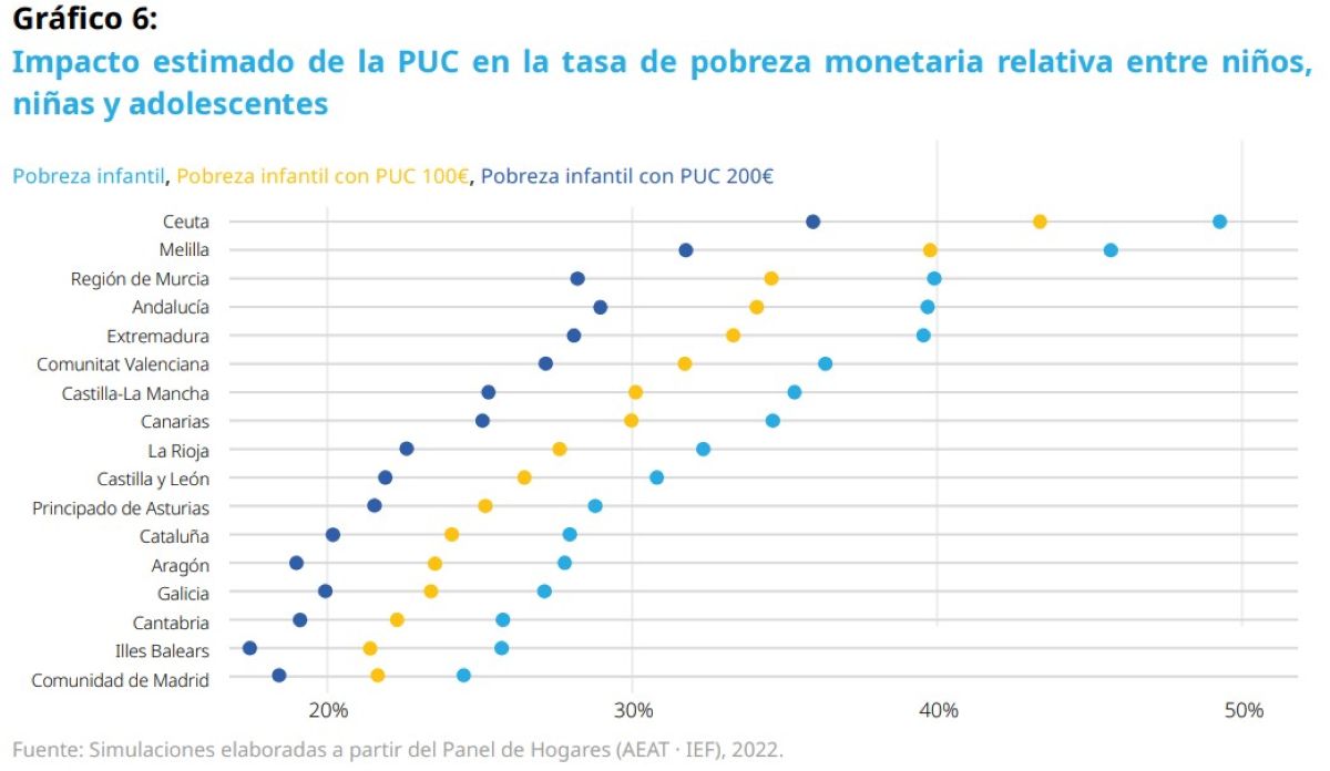 Así las cosas, el informe de Unicef también estima cuál sería el coste de implementar esta medida. Concretamente, el organismo detalla que "con una cuantía fija de 100 euros mensuales por menor (1.200 al año), el coste bruto anual se situaría en unos 9.052 millones de euros a nivel nacional". Asimismo, "con 200 euros mensuales ascendería a 18.103 millones".