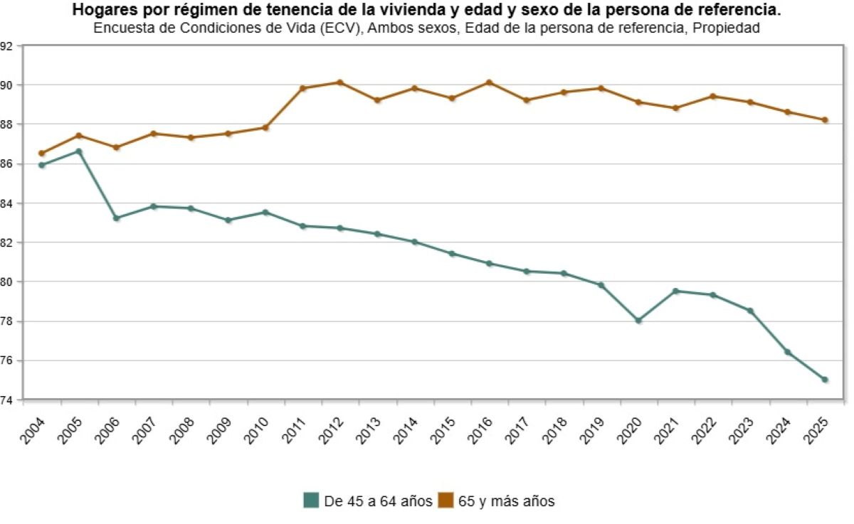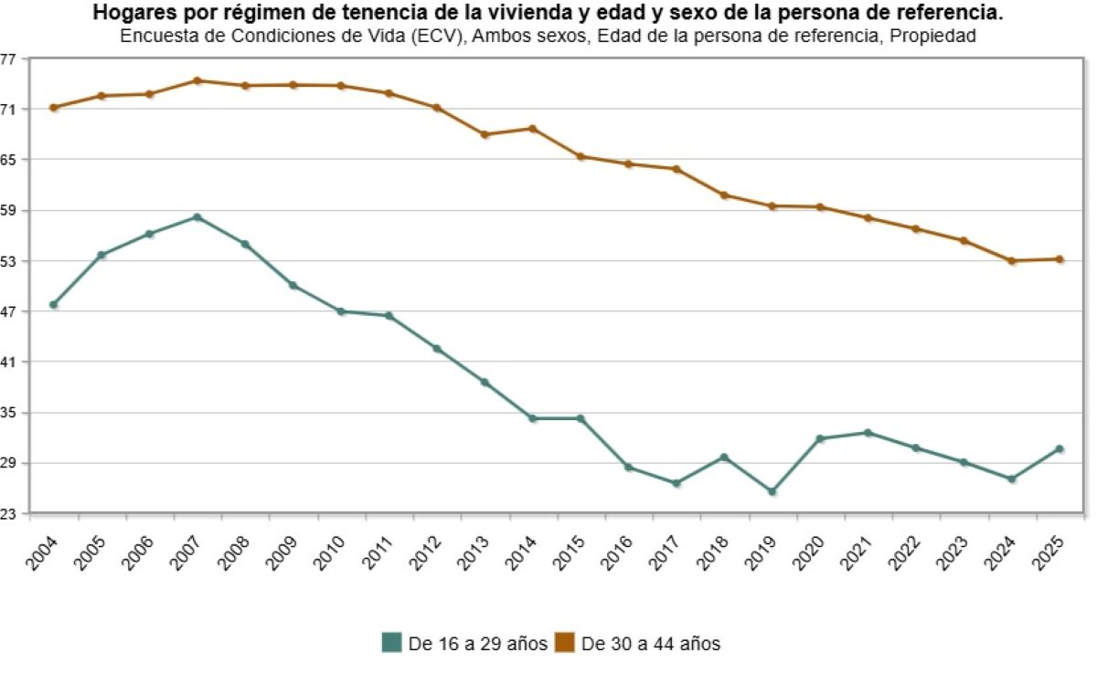 En este contexto, los jóvenes de entre 16 a 29 años –el único segmento poblacional que mejora– que tienen una vivienda en propiedad ha pasado del 29,6% en 2018 al 30,6% en 2025, con un incremento de 1 punto porcentual en este período. Del mismo modo, podemos comprobar en el caso de las personas de una edad de entre 30 y 44 años que tiene vivienda en propiedad ha caído de 60,7% al 53,1% en este período, registrando una caída de 7,6 puntos.