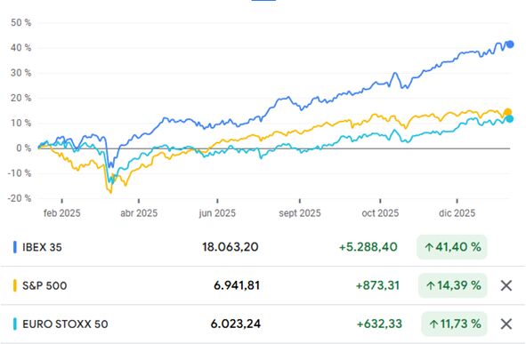 Podemos ver cómo los grandes índices mundiales han sido muy positivos para los inversores, con subidas del 40% en el Ibex 35, donde los analistas siguen viendo recorrido al alza por valoraciones y negocios de calidad.