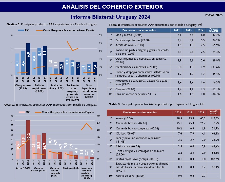España exporta principalmente a Uruguay productos agroalimentarios elaborados, bebidas —con el vino y las bebidas espirituosas a la cabeza—, prendas textiles y de confección, así como productos de perfumería, cosmética y aseo. También destaca el sector del mueble, donde las empresas españolas gozan de una buena posición.