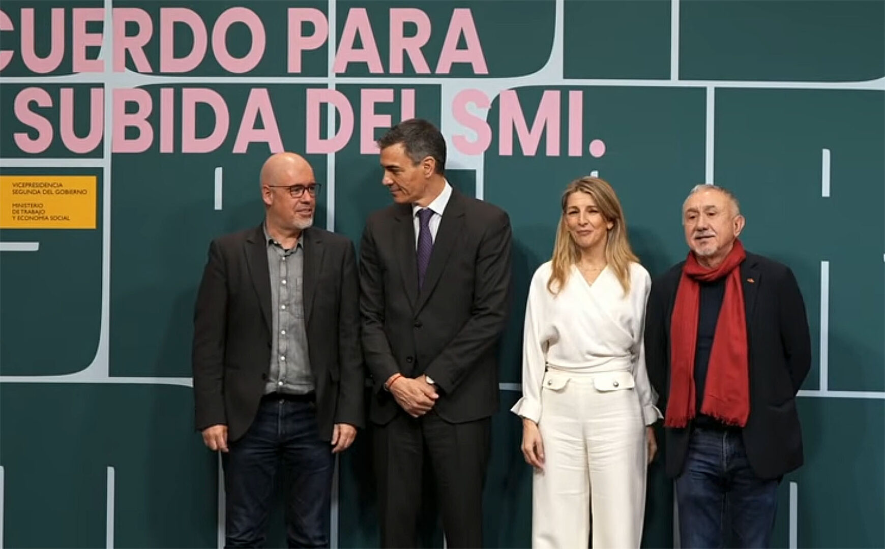 Así mismo, la vicepresidenta y ministra de Trabajo, Yolanda Díaz ha insistido en que el de hoy "es un día importante" y no sólo por la medida económica en sí, sino por la presencia de Pedro Sánchez en su Ministerio. "Hoy es la primera vez que se asiste a este ministerio encabezados además por el presidente del Gobierno" decía en referencia a la cantidad de personalidades y compañeros de Consejo de Ministros como María Jesús Montero, Elma Saiz, Pablo Bustinduy, pero también han estado presentes la presidenta del Congreso, Francina Armengol y hasta el delegado del Gobierno en Madrid, Francisco Martín. Hasta ahora en los actos de firma de aumento del SMI solamente estaban Yolanda Díaz y los sindicatos de clase. "En política los símbolos tienen una importancia extraordinaria", recalcaba Díaz quien ha contado la comidilla de los pasillos: "hay un run run entre los funcionarios diciendo: oh, viene el presidente del Gobierno al Ministerio de Trabajo y no al revés". En sus últimos tres minutos de intervención, Yolanda Díaz ha querido reivindicar su papel dentro del Ministerio recordando que hace seis años, cuando fue designada y cerró el acuerdo para subir el SMI en 50 euros -hasta los 950- Sánchez estaba en el Foro de Davos desde donde la llamó para darle las gracias y eso que "apenas nos conocíamos", ha dicho. Una muestra de que, desde entonces, ella se ha dejado la piel por los trabajadores. "Querido presidente, desde aquella llamada hasta hoy he hecho lo que tenía que hacer, defendiendo en todo momento, de manera no neutral, a la gente trabajadora de este país", decía justificando su labor.