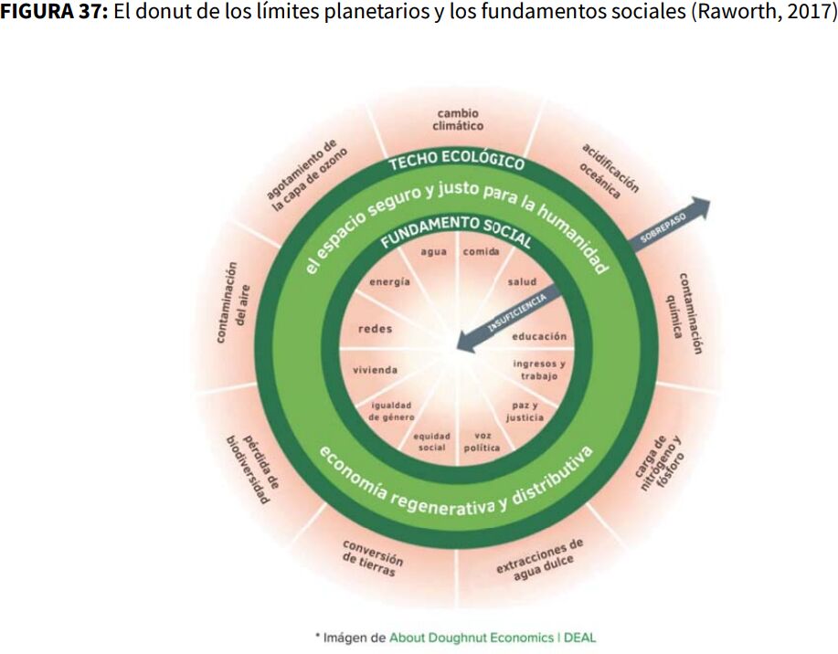 El objetivo es lograr un espacio seguro y justo para la humanidad, una zona con forma de dónut en la que el uso de los recursos esté por encima del nivel necesario para satisfacer las necesidades básicas de las personas (evitando el agujero en el centro, que representa el déficit social), pero por debajo del nivel que conlleva un riesgo sustancial de sobrepasar los nueve límites planetarios (evitando sobrepasar el techo ecológico) (Raworth, 2017). Este marco prevé una economía regenerativa y distributiva que funcione dentro de estos límites (Raworth, 2017)".