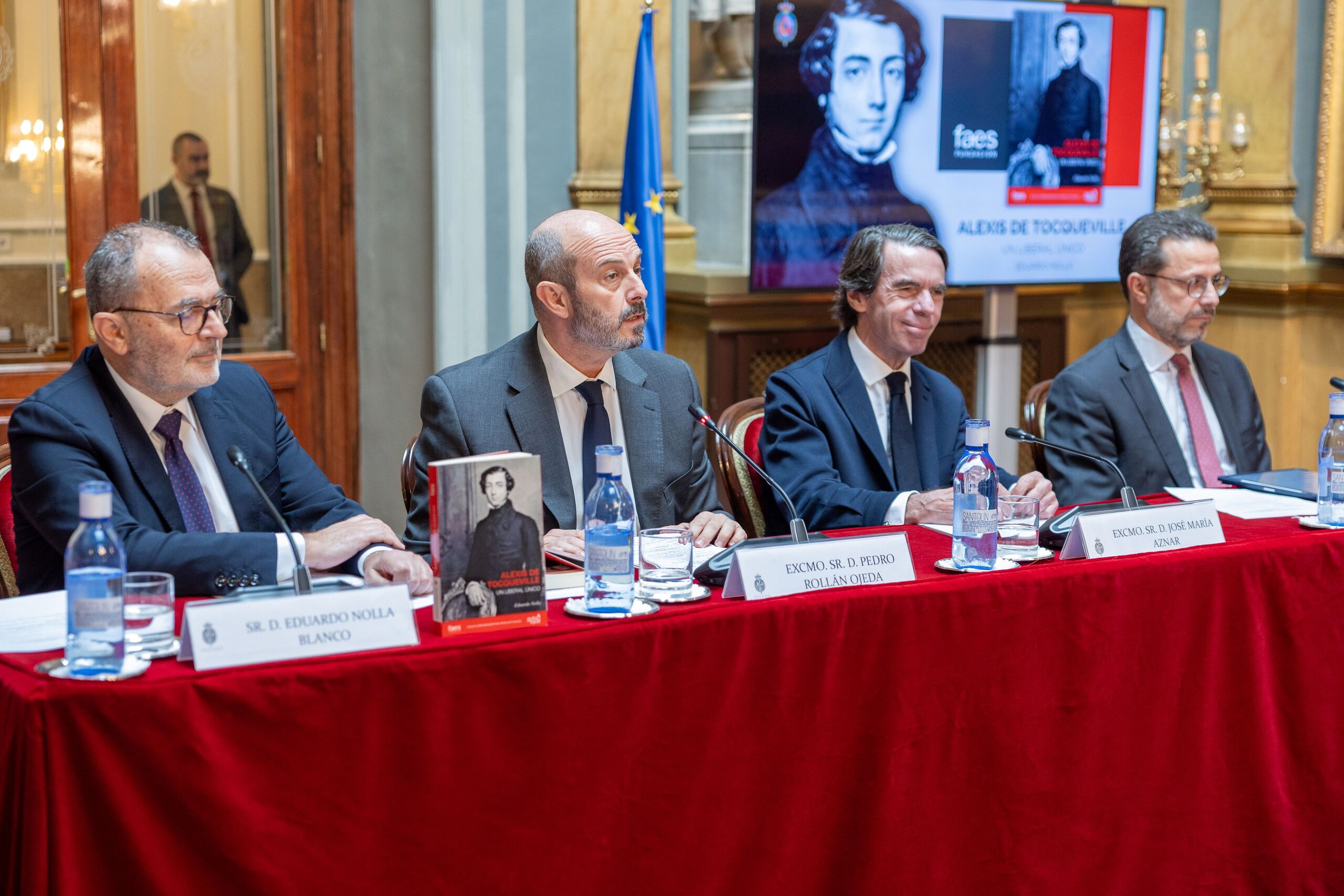 Precisamente, la Fundación FAES acaba de presentar este jueves la biografía del pensador francés, 'Tocqueville, un liberal único', elaborada por Eduardo Nolla, catedrático de Teoría Política y uno de los mayores expertos a nivel mundial en la figura y el pensamiento del autor de La democracia en América. De este modo, en el acto de presentación han participado, además del propio autor, el expresidente del Gobierno y presidente de FAES, José María Aznar, el exconsejero de Hacienda y Economía de la Comunidad de Madrid, Javier Fernández-Lasquetty, y el presidente del Senado, Pedro Rollán, que han puesto en valor la obra de Tocqueville.