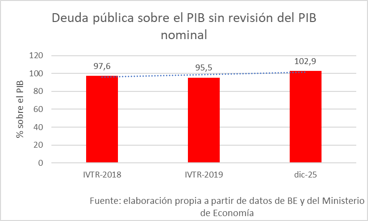 …sin esa revisión, sería del 102,9% del PIB. Es decir, la revisión extraordinaria del PIB rebaja en 2 puntos el cociente, pero la deuda sube con fuerza en valores absolutos:
