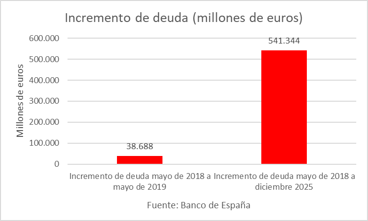 Todo ello, nos lleva a que desde que gobierna Sánchez la deuda se ha incrementado en 541.344 millones de euros. Durante el primer año, aumentó en 38.688 millones, y al cabo de siete años y medio de mandato el incremento es de 540.000 millones de euros, según las notas mensuales iniciales publicadas por el Banco de España sobre la deuda de las AAPP.