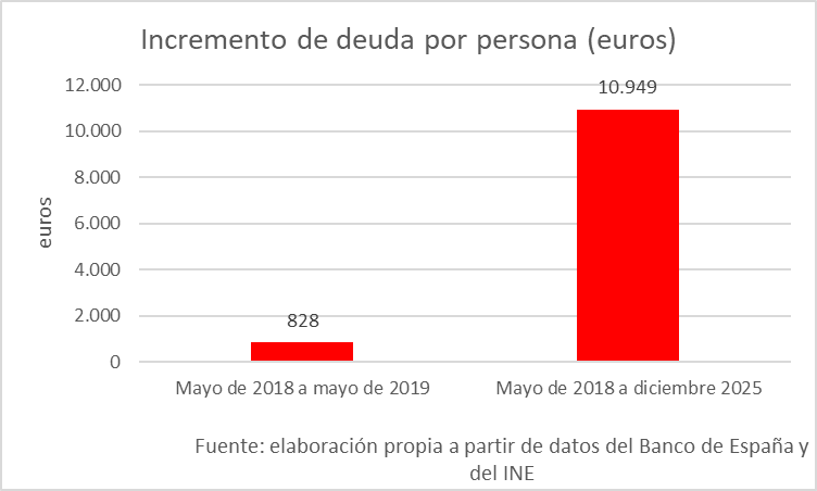 Así, si durante el primer año creció la deuda por persona en 828,03 euros, en los más de siete años y medio de mandato de Sánchez la deuda por persona ha aumentado en 10.949 euros (más de trece veces el incremento del primer año).