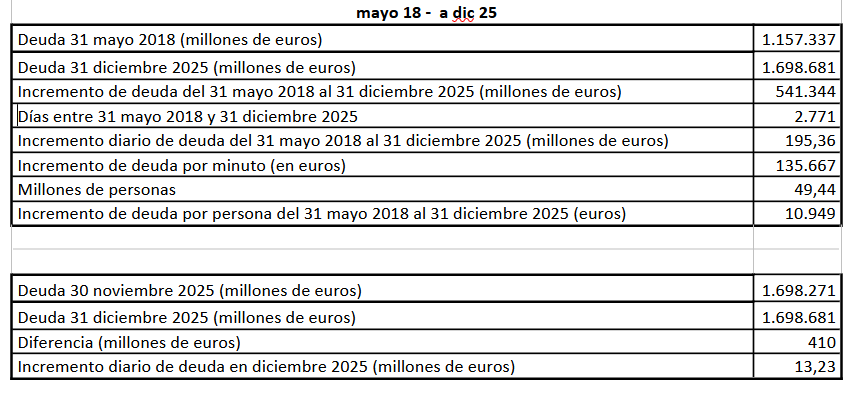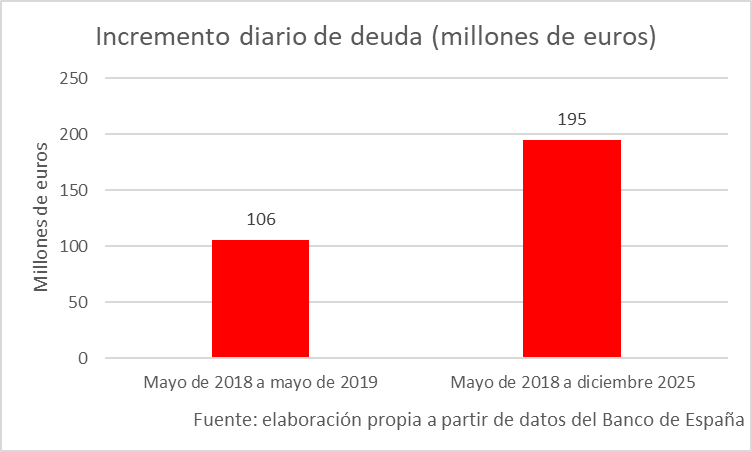 O visto de otra manera: en el primer año, la deuda se incrementaba a un ritmo de 105,99 millones de euros al día. Ahora, tras casi siete años de Gobierno de Sánchez, la deuda crece 195,36 millones de euros cada día.