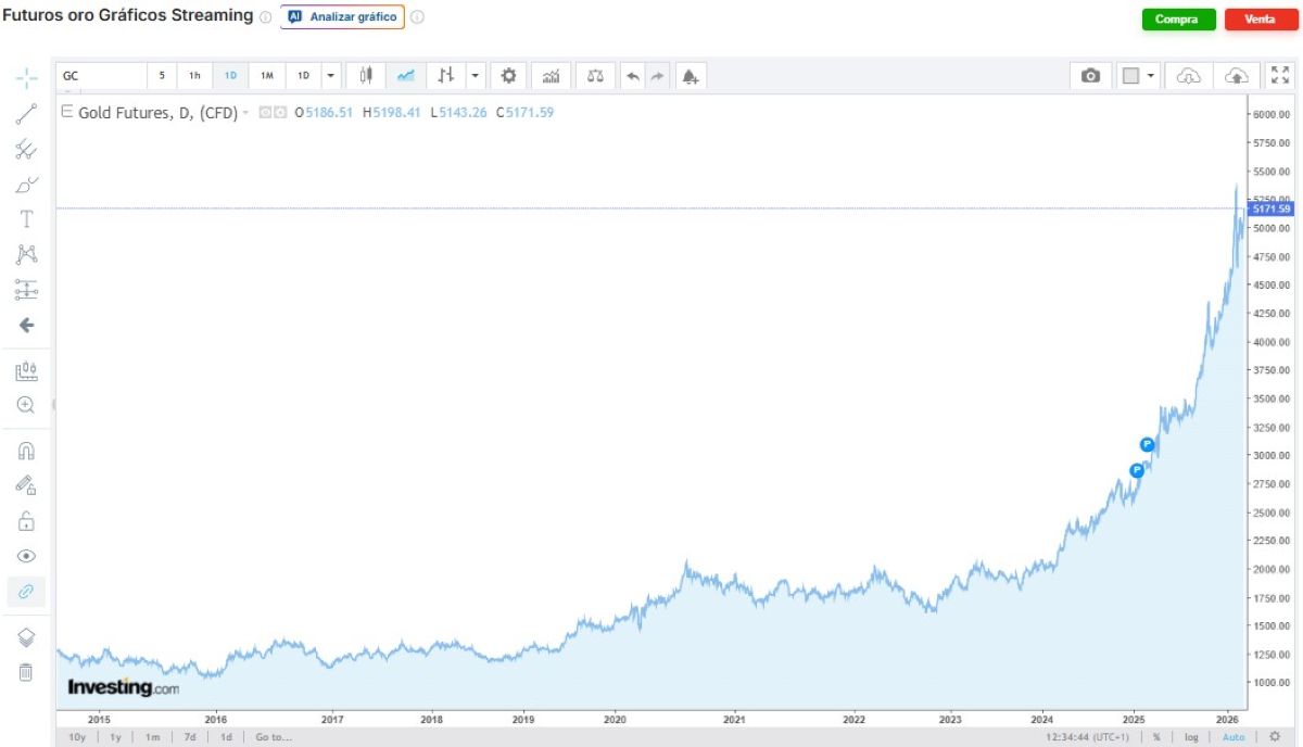 En este contexto, el metal que centra la mayor atención es el oro, puesto que supone el gran activo refugio tradicional. Y es que, aunque en las últimas semanas este activo sufrió una importante caída tras marcar máximos históricos en los 5.600 dólares por onza, ya está recuperando parte de lo perdido. De hecho, como podemos comprobar a continuación, a 23 de febrero la cotización de la onza de oro supera de nuevo los 5.100 dólares, acercándose poco a poco a los 5.200 dólares por onza.