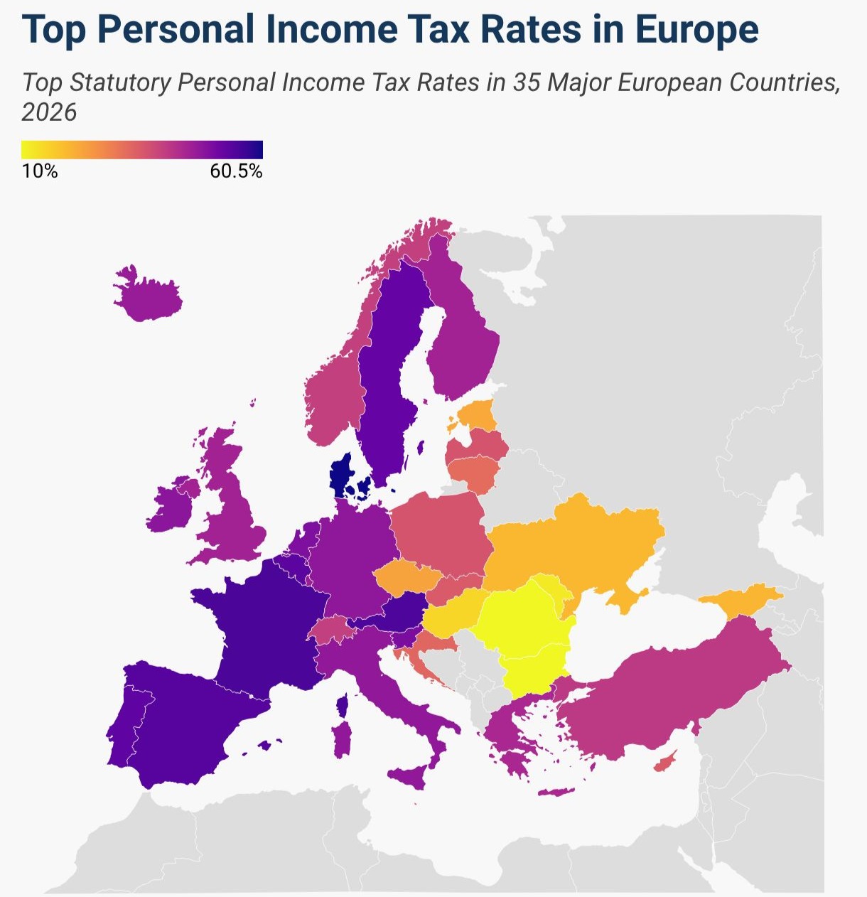 Así las cosas, Tax Foundation informa de que varios países europeos han modificado sus tipos máximos del impuesto sobre la renta personal con respecto al año pasado. De este modo, el informe explica que "Dinamarca ha añadido un tramo adicional del impuesto sobre la renta para ingresos superiores a 2,8 millones de coronas danesas (375.000 euros), aumentando su tipo máximo del 55,6% al 60,5%", mientras que Eslovaquia "añadió dos tramos impositivos adicionales". Por su parte, "Finlandia redujo su tipo impositivo máximo del 25% al 35%".