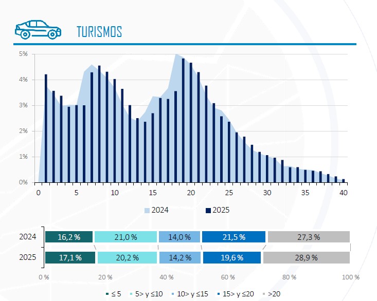 Mientras, los automóviles a partir de 10 años de antigüedad son los más numerosos, con un 62 por ciento del parque. Los vehículos nuevos, de menos de 5 años, representan el 17,3 por ciento del parque aunque suben un 6,7 por ciento respecto a 2025.