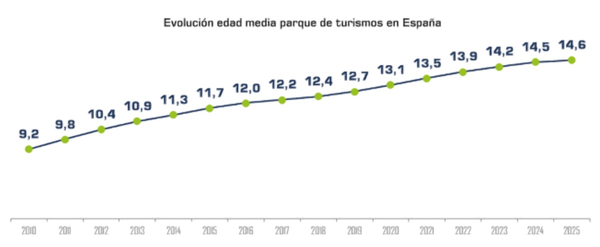 Un nuevo estudio certifica el paulatino envejecimiento del parque automovilístico español. La edad media de los turismos en nuestro país ascendió a 14,6 años, frente a los 12,7 de la media europea, según el informe relativo a 2025 elaborado por la patronal automovilística española, Anfac, e Ideauto. En 2010, la edad media era de sólo 9,2 años.
