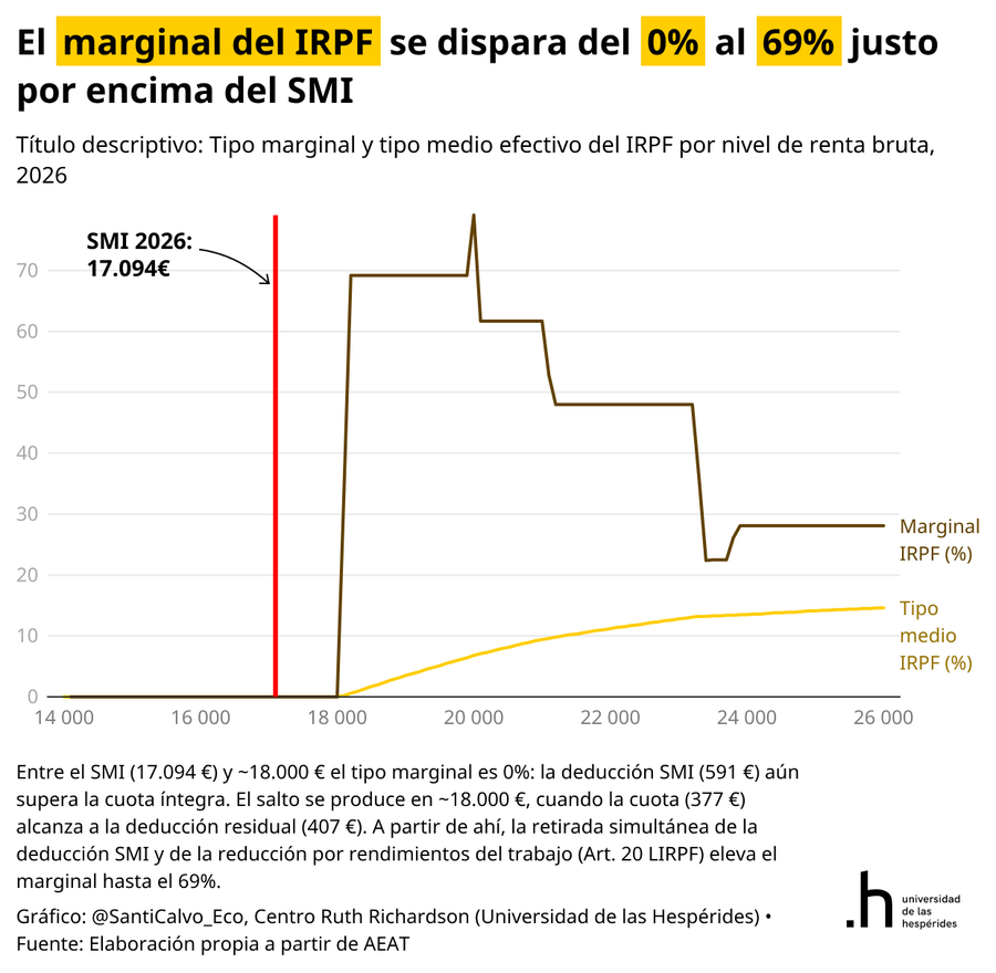 En virtud de esta decisión, el Ministerio de Hacienda ha ampliado la deducción hasta 591 euros para quienes ganan el SMI, pero esta medida, que se reduce progresivamente hasta desaparecer a partir de los 20.000 euros, genera un "efecto joroba" en la curva impositiva del gravamen aplicado sobre los sueldos de los trabajadores. Así, justo por encima del SMI, entre 18.500 y 20.000 euros, el marginal efectivo del IRPF alcanza picos del 79%, combinando el tipo nominal con la retirada simultánea de la deducción por SMI y la reducción por rendimientos del trabajo (artículo 20 de la Ley del IRPF).