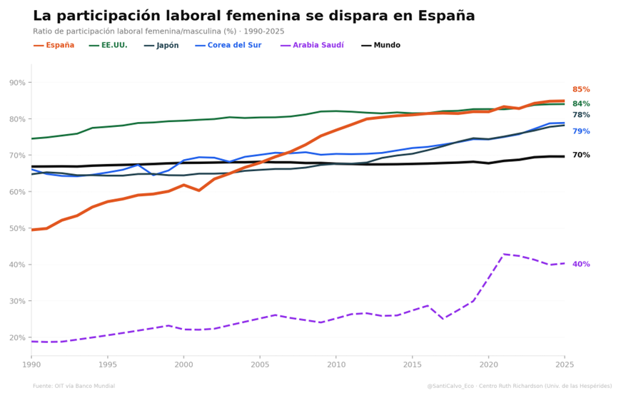 En 1990, la ratio de participación laboral femenina respecto a la masculina en España era del 49%. Treinta y cinco años después ha escalado hasta el 85%, superando a Estados Unidos y acercándose a niveles nórdicos. La media mundial se mantiene estable en torno al 70%, lo que convierte el caso español en uno de los procesos de convergencia más intensos del mundo desarrollado.