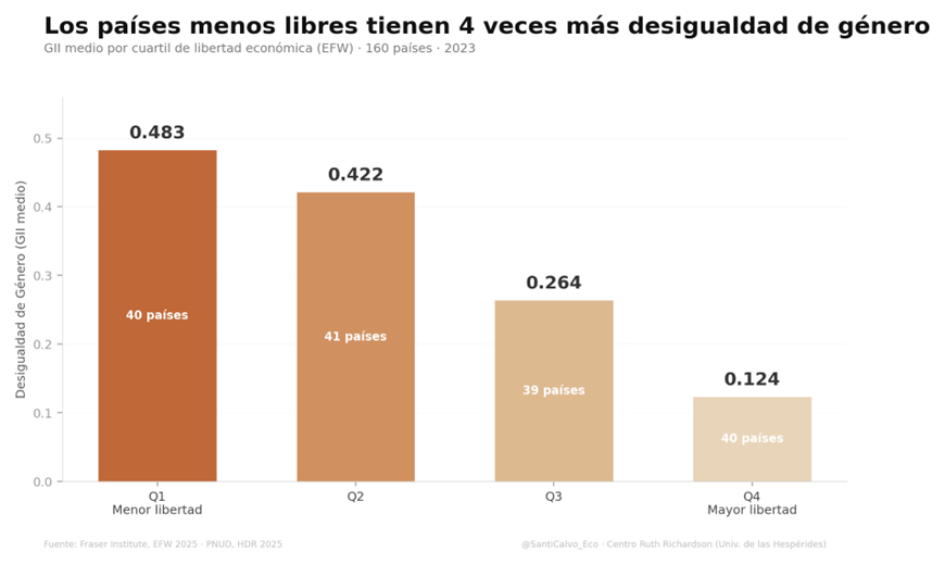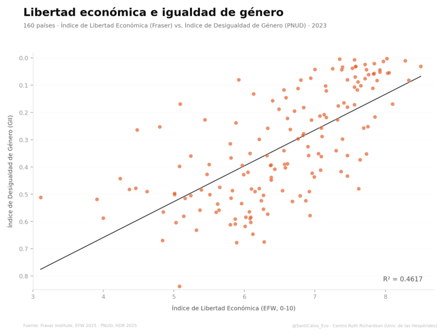 Cruzando el Índice de Libertad Económica del Fraser Institute con el Índice de Desigualdad de Género del PNUD para 160 países, la relación es robusta: a mayor libertad económica, menor desigualdad de género. Donde hay derechos de propiedad sólidos, mercados abiertos y regulación proporcionada, las mujeres prosperan más.