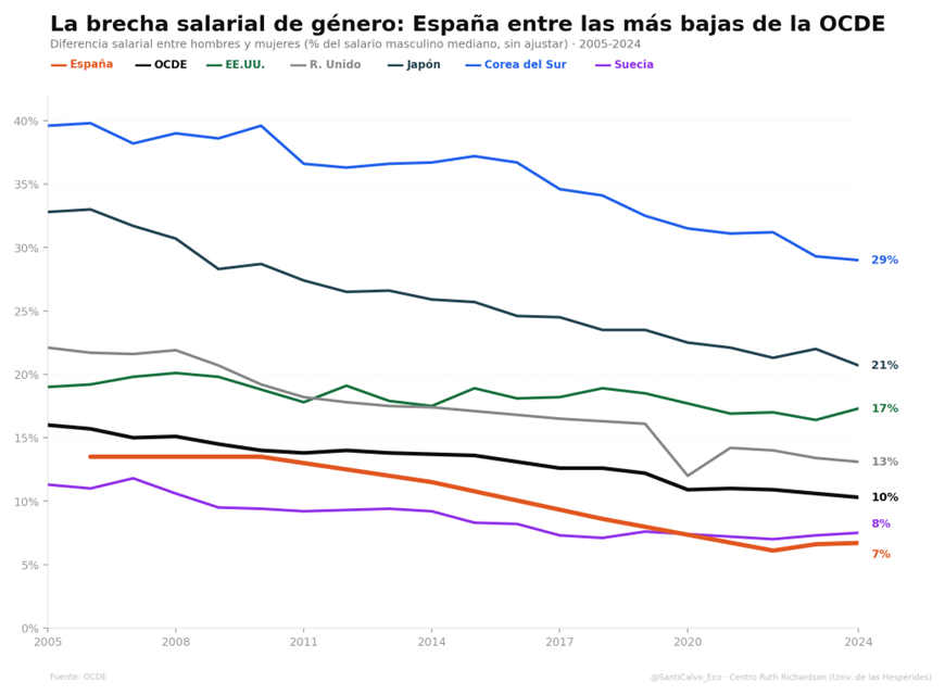 Los datos de la OCDE (2024) sitúan a España con una brecha salarial del 7%, entre las más bajas, por debajo de la media OCDE (10%) y muy lejos de Corea del Sur (29%) o Japón (21%). Esta es una medida sin ajustar: refleja diferencias en horas, sectores, experiencia y jornada. Cuando se controlan estas variables, la brecha ajustada prácticamente desaparece. La discriminación salarial directa está prohibida por ley en toda la OCDE.