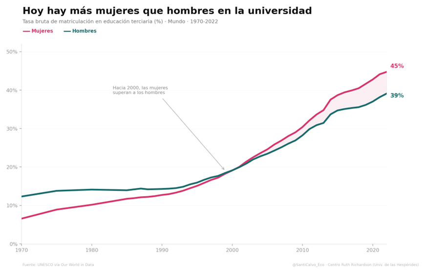 En 1970, la tasa de matriculación femenina en educación terciaria era del 7%, frente al 12% masculino. Hacia 2000, las mujeres alcanzaron a los hombres. Y desde entonces les han superado: en 2022, un 45% frente a un 39%. La brecha educativa se ha invertido. Es difícil hablar de un sistema que discrimina a las mujeres cuando ellas son mayoría en la universidad en prácticamente todo el mundo desarrollado.