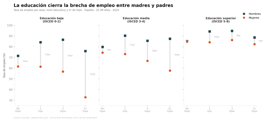 La maternidad sigue siendo el factor que más explica las diferencias laborales entre sexos. Pero los datos de Eurostat para España muestran que la educación neutraliza este efecto. Con educación baja y tres o más hijos, la brecha de empleo entre hombres y mujeres es de 43 puntos. Con educación superior y el mismo número de hijos, se reduce a 6 puntos. El capital humano —no la regulación— es el gran ecualizador.