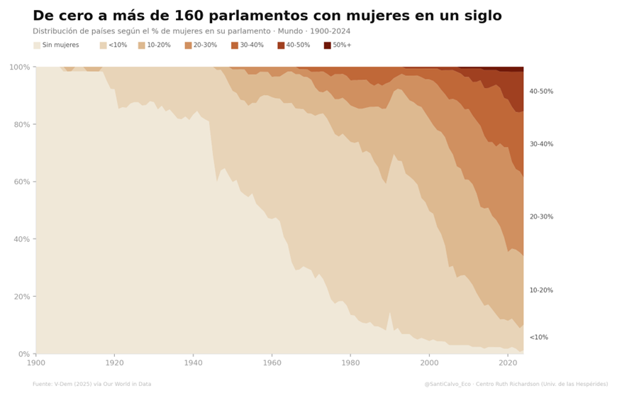 En 1920, de 64 parlamentos, 59 no tenían ni una sola mujer. En 2024, solo dos carecen de representación femenina. Más de 60 países superan el 30% de mujeres en sus cámaras.