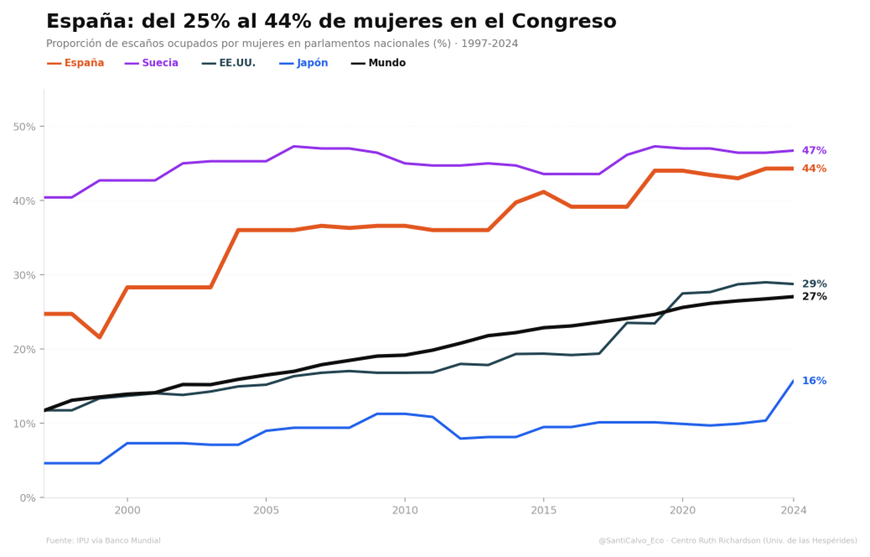 En 1997, las mujeres ocupaban el 25% del Congreso. Hoy superan el 44%, por delante de Estados Unidos (29%), cerca de Suecia (47%) y muy por encima de la media mundial (27%).