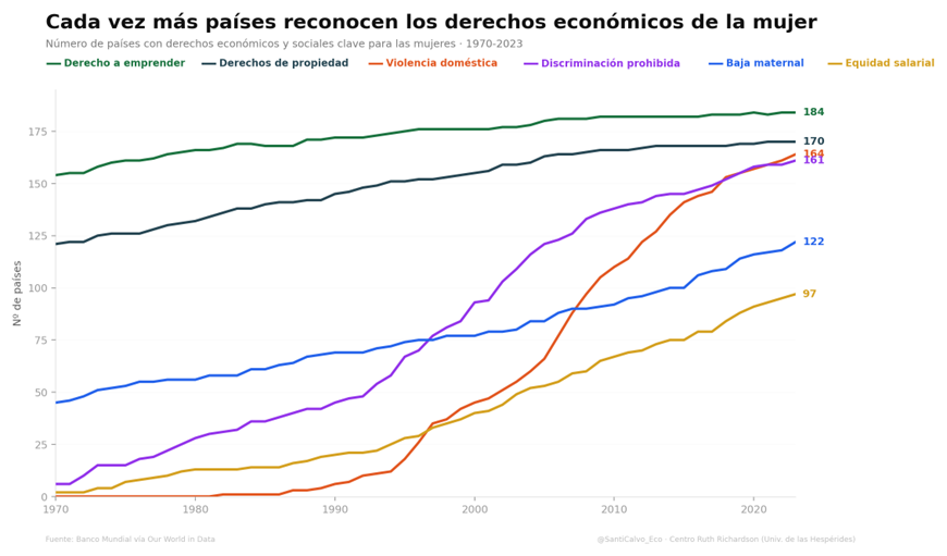 En 1970, solo seis países prohibían la discriminación laboral por sexo. En 2023, lo hacen 161. La equidad salarial está mandatada en 97, la violencia doméstica sancionada en 164 y el derecho a emprender garantizado en 184.