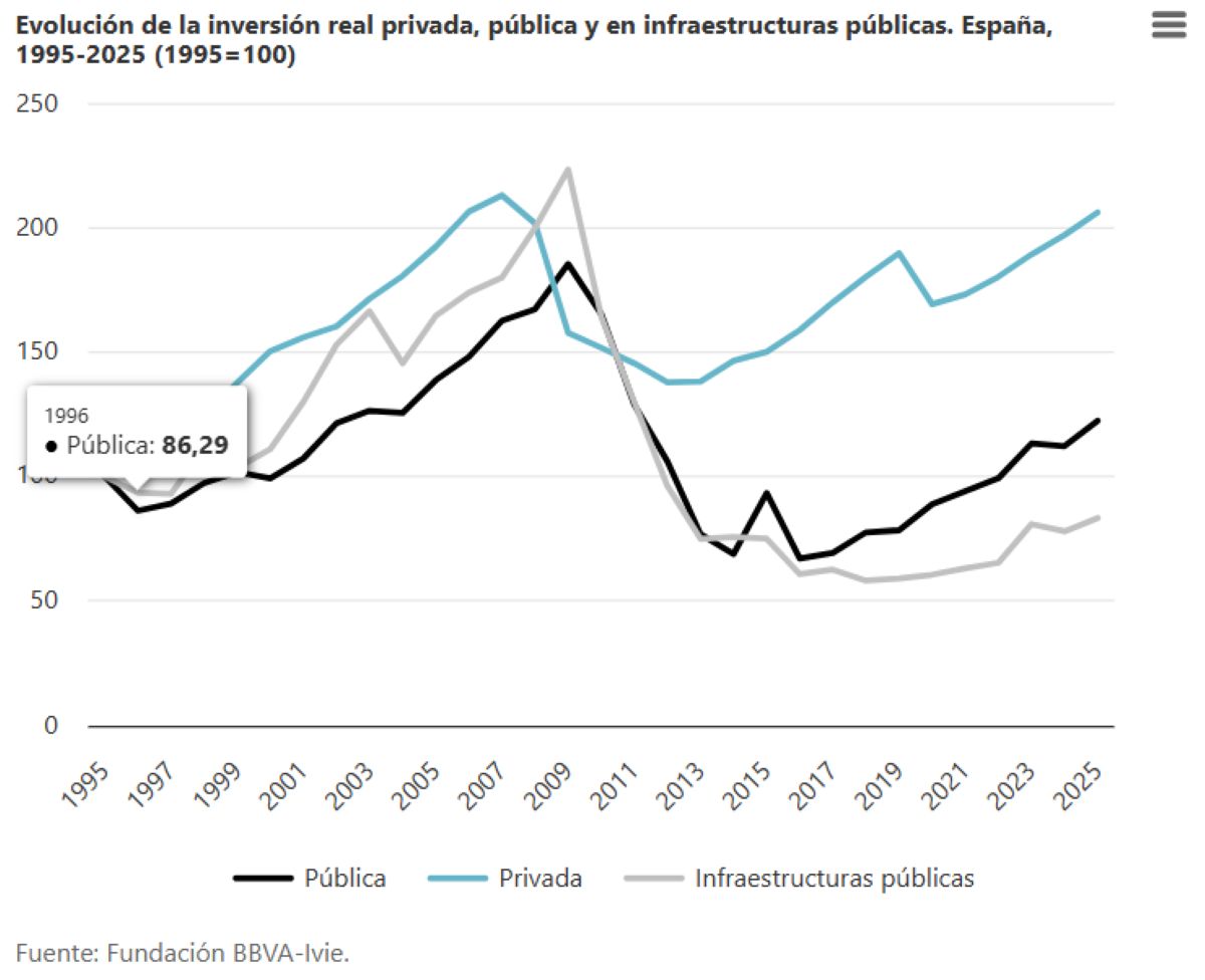 Una de las conclusiones principales del estudio publicado por la Fundación BBVA y el Ivie es que la inversión pública sufrió la mayor caída durante la Gran Recesión, "pues sus recortes se utilizaron como un instrumento clave para cumplir con los ajustes fiscales impuestos por los mercados financieros y la Unión Europea". Así, se explica que "tras permanecer en niveles muy bajos entre 2012 y 2020, en los últimos cinco años crece impulsada por los fondos Next Generation UE, pero sigue alejada de las cifras máximas de inversión de los años finales del boom inmobiliario".