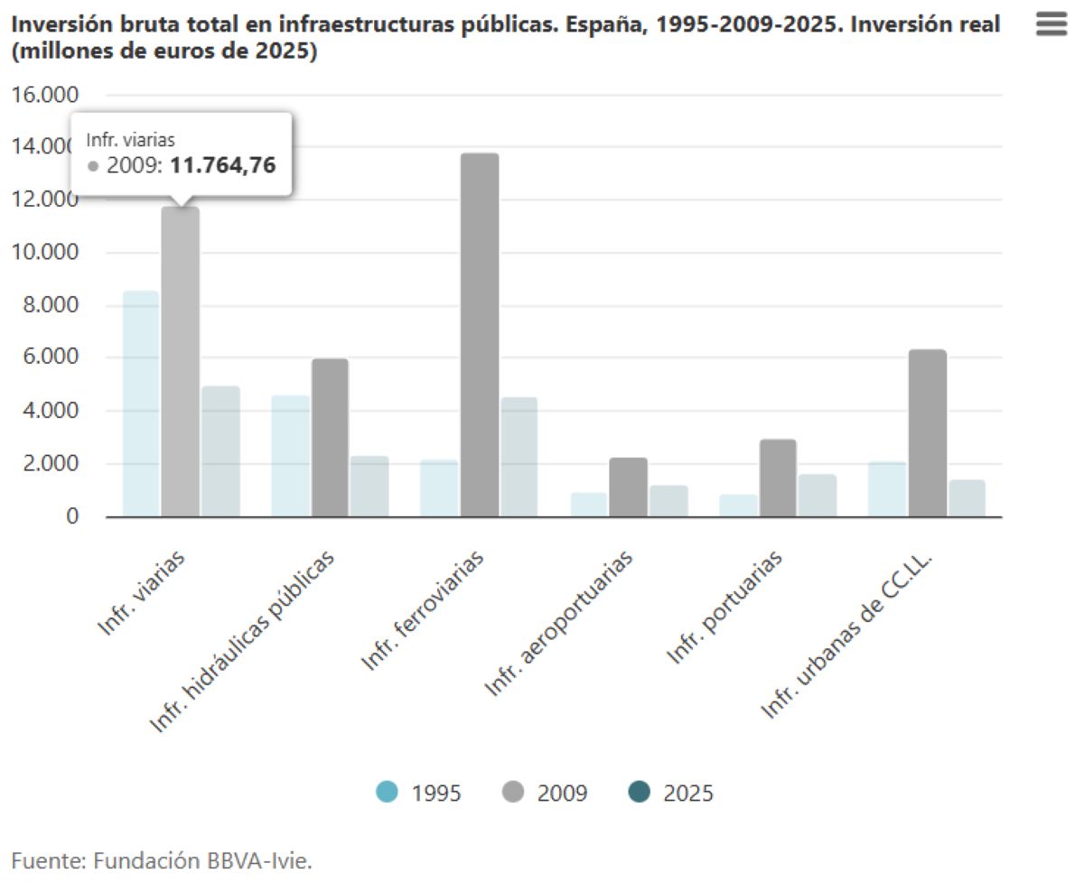En este sentido, el informe detalla que "en total, la inversión en infraestructuras en 2025 asciende a 16.114 millones de euros, un 6,8% más que el año anterior; pero es un 60% inferior a la cifra alcanzada en 2009". Así, se explica cómo "la inversión en infraestructuras públicas se desplomó a partir de 2010, mucho más que la inversión en dotaciones de tipo social, por lo que el peso de las primeras se ha reducido considerablemente".