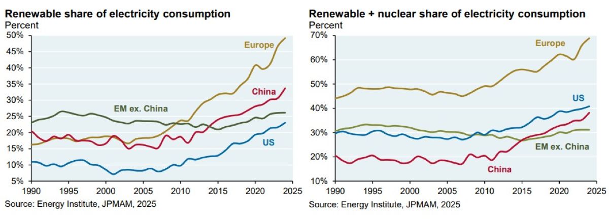 Con todo, el estudio incide en que Europa lidera en términos de generación de energía renovable y limpia –incluyendo la energía nuclear–. De este modo, se detalla que, utilizando el indicador de energía limpia, la cuota de generación sería: Suecia 99%, Suiza 94%, Francia 95%, Dinamarca 85%, España 75%, Alemania 57%, Países Bajos 53% e Italia 49%. Además, JP Morgan destaca que "el 70% de la cuota de energía limpia en Europa se compone de energía eólica/solar (25%), nuclear (20%), hidroeléctrica (18%) y biomasa (6%)".