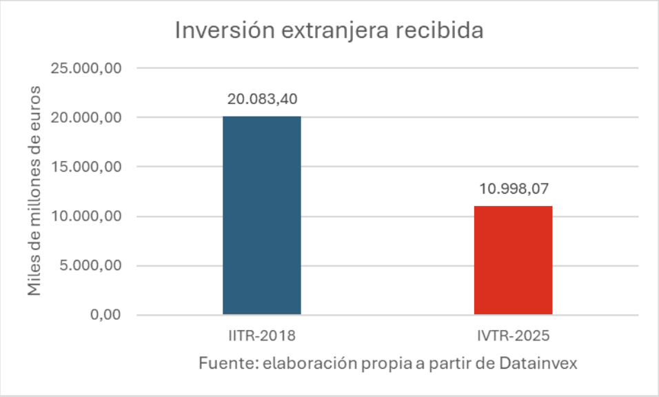 Sin embargo, los datos de la evolución de la inversión extranjera en España de los últimos casi siete son demoledores, como puede observarse con los datos del cuarto trimestre de 2025 –último dato publicado recientemente–. Se queda en la mitad de los que se recibían trimestralmente en el momento en el que Sánchez llegó al Gobierno: en el IITR-2018 se recibían 20.083,40 millones de euros; ahora, en el IVTR-2025, se han recibido 9.085,33 millones de euros.