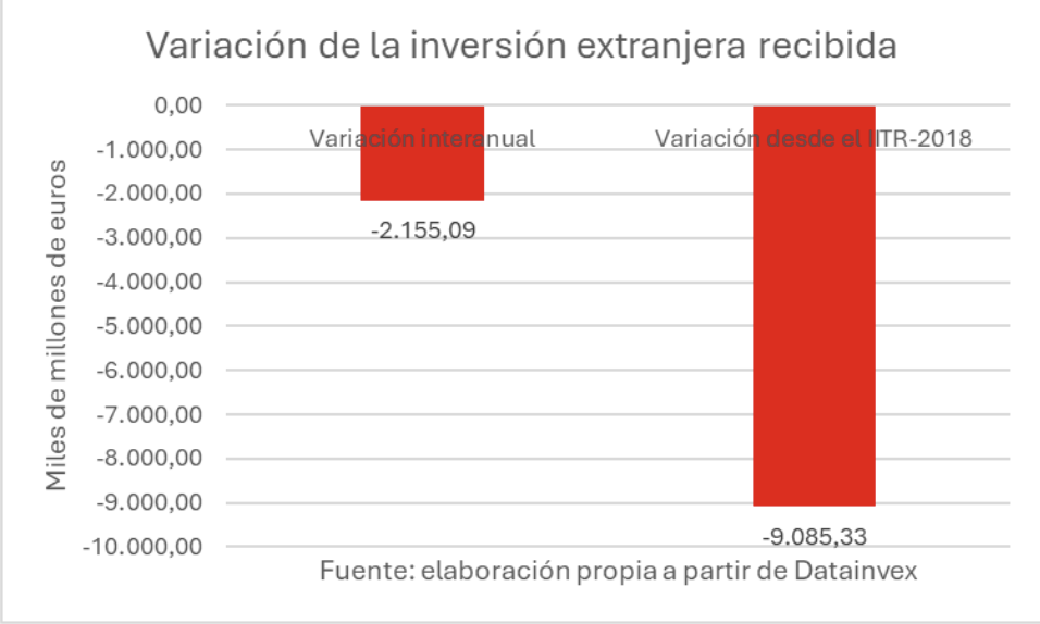 Ahora bien, esa desconfianza de la inversión extranjera con la política económica de Sánchez se ha ido acrecentando, pero desde el principio desconfió de él. De hecho, nada más llegar ya se produjo un deterioro en la inversión extranjera en España, perdiendo de un trimestre a otro más de 3.000 millones de euros, pero se podría pensar que podía ser fruto de venir de alguna operación especial de inversión anterior.