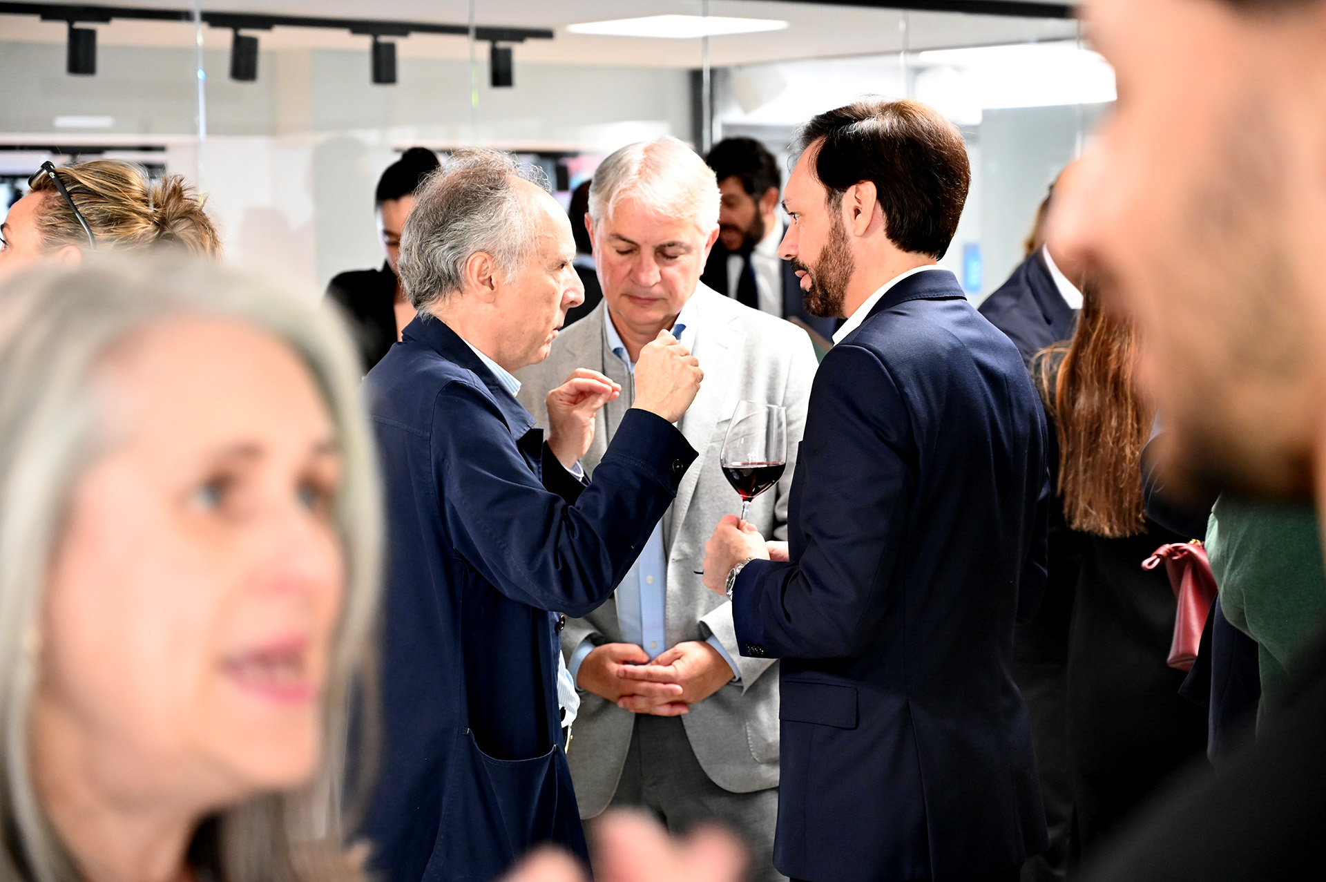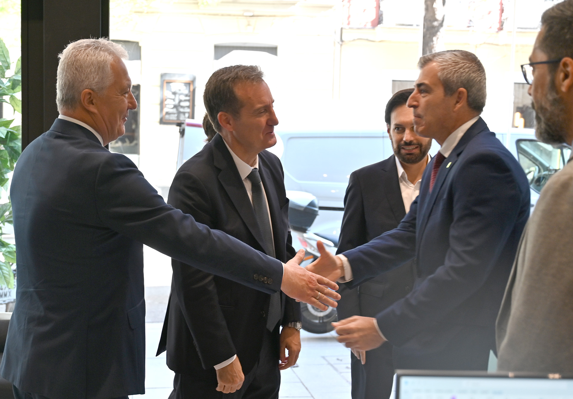 Luis Rodríguez, director general de Libertad Digital; y Juan Rodríguez Plaza, director de relaciones institucionales de Libertad Digital saludando a Manuel Domínguez, vicepresidente de las Islas Canarias en el bufete Cremades & Calvo Sotelo en Madrid, donde ha tenido lugar el Hub de Canarias organizado por Libertad Digital.