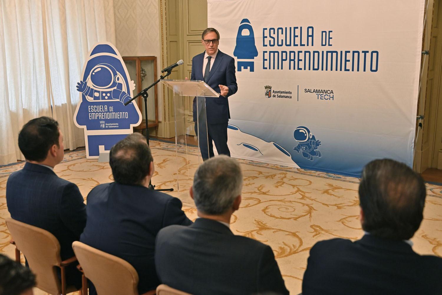 El alcalde de Salamanca, Carlos García Carbayo, ha presentado este viernes la Escuela de Emprendimiento del Ayuntamiento de Salamanca, que nace con la voluntad de aunar en un único proyecto todas las iniciativas municipales dirigidas a fomentar la creación de oportunidades de empleo en la ciudad, especialmente en los jóvenes para que puedan desarrollar su proyecto de vida en Salamanca.