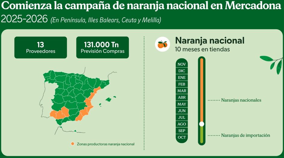Arranca la campaña nacional de la naranja en Mercadona, compañía de supermercados físicos y de venta online que prevé comercializar 131.000 toneladas de este cítrico durante la campaña 2025/26. Para la presente campaña, que acaba de comenzar y se alargará aproximadamente hasta el próximo mes de agosto, la compañía comercializará naranjas procedentes de campos de Comunidad Valenciana, Andalucía, Región de Murcia y Catalunya, gracias a la colaboración con los proveedores Martinavarro, Bollo, Fontestad, Frutas Tono, Frutinter, Anecoop, Alcafruit, Lasarte, Agronostrum, AM Fresh Spain Citrus, Grupo Llusar Torres, Vicente Giner y Nufresco.