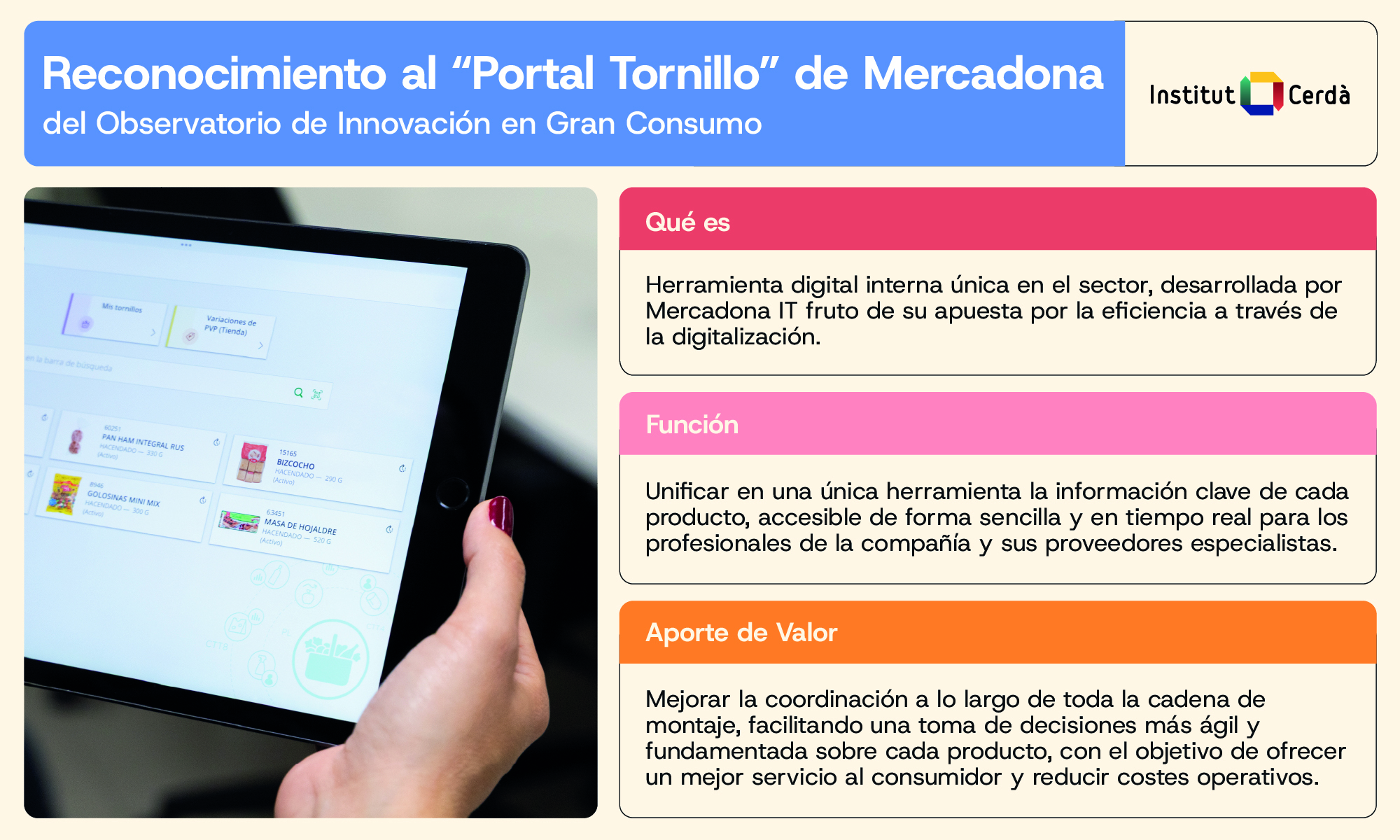 El Observatorio de Innovación en Gran Consumo del Institut Cerdà, formado por un grupo de expertos independientes, ha presentado esta mañana las principales innovaciones del sector de la distribución en 2025. En su novena edición, los expertos han reconocido el 'Portal Tornillo' de Mercadona, herramienta interna desarrollada por el equipo de Mercadona IT que agiliza la gestión del surtido.