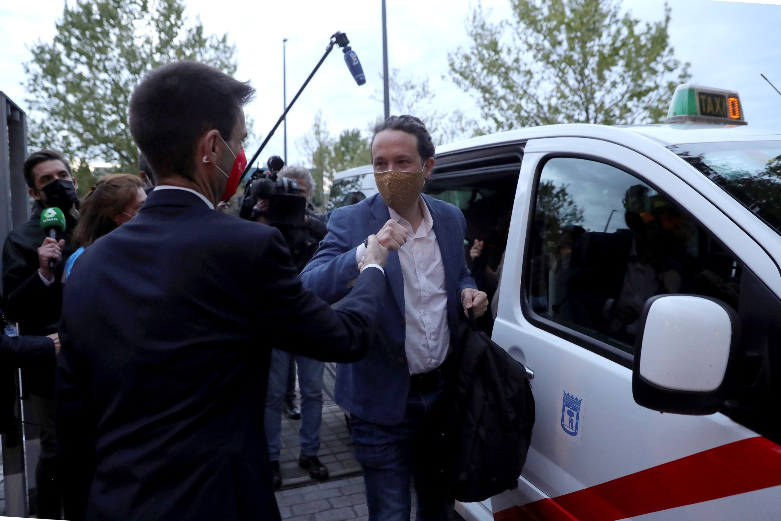 Tras el debate, el líder de Podemos y candidato en Madrid dejó los gestos a un lado y se marchó, esta vez sí, en su coche oficial rumbo a su residencia en Galapagar.