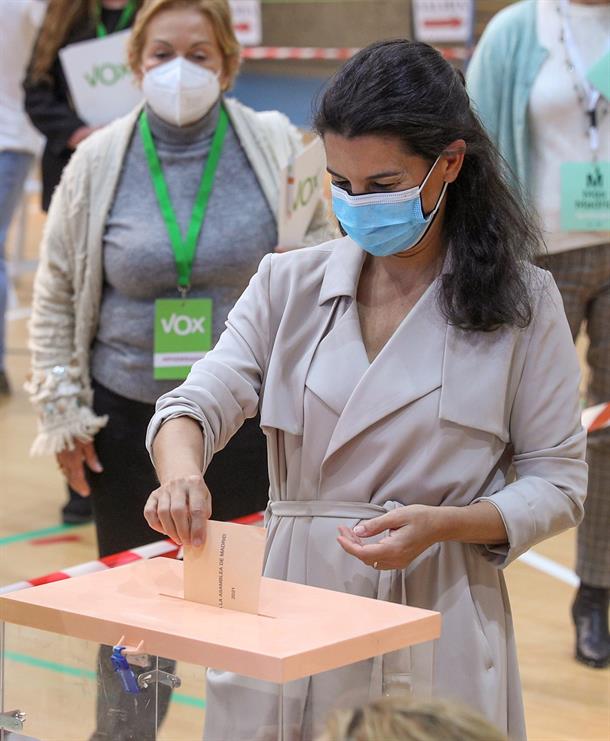 La candidata de Vox a la Presidencia regional, Rocío Monasterio, vota en el Colegio San Agustín de Madrid en las elecciones autonómicas que este martes vive la Comunidad.