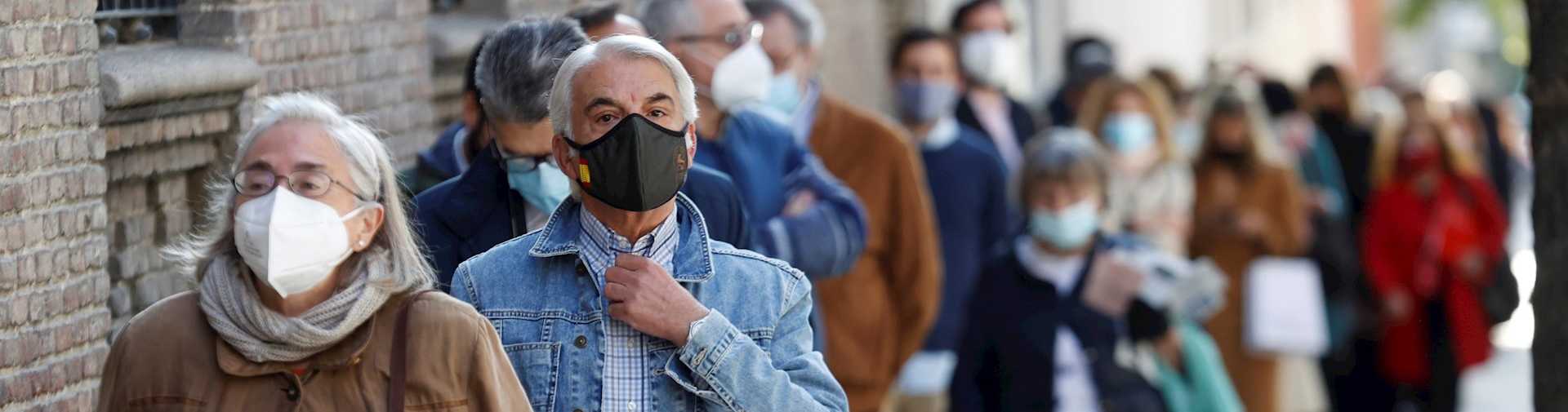 otantes esperan una larga cola a las puertas del IES Cardenal Cisneros en Madrid durante la jornada electoral, este martes.