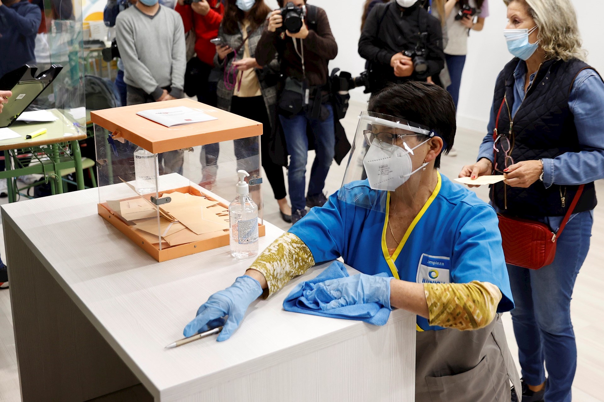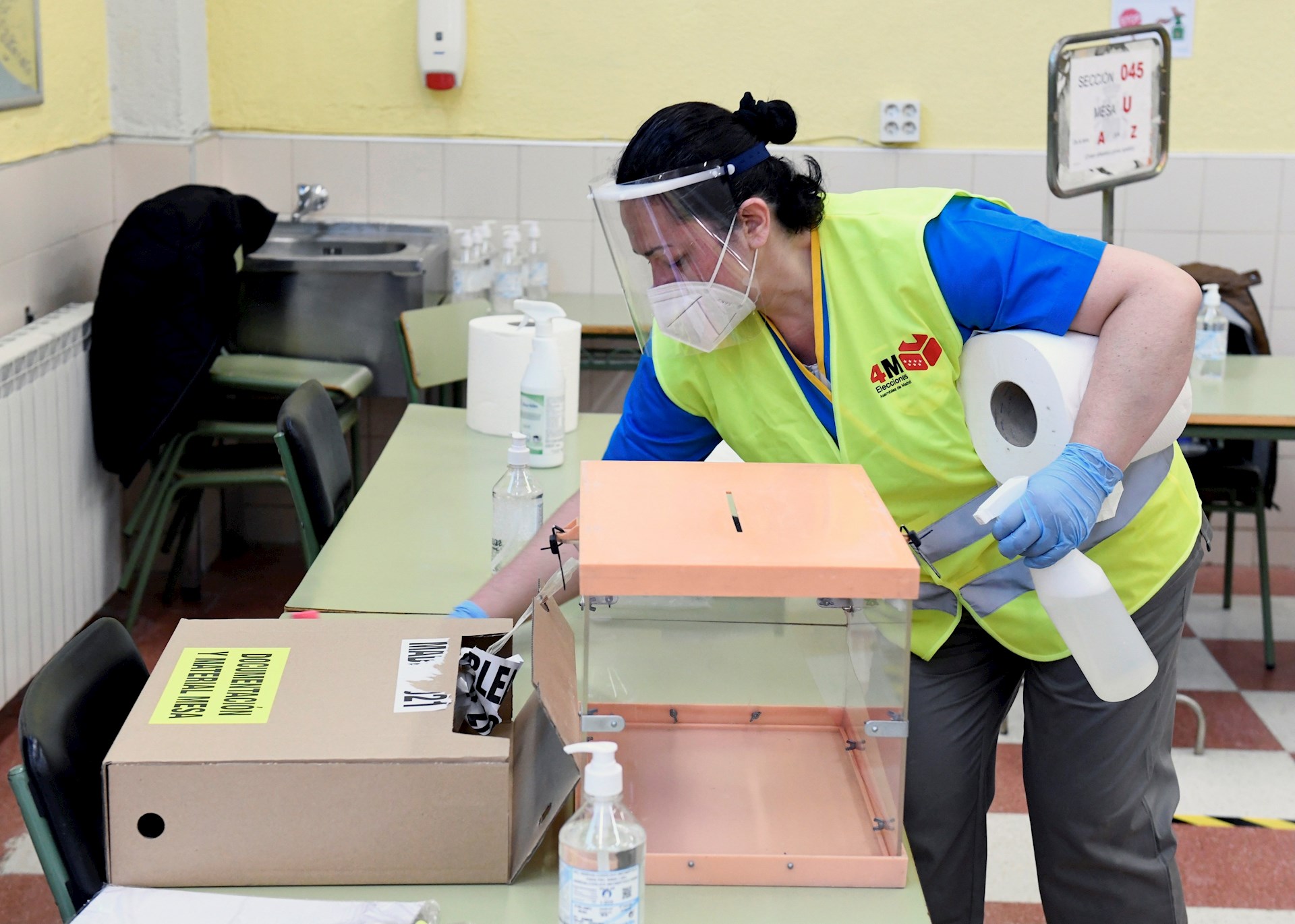 Una empleada de la limpieza desinfecta una mesa electoral en el colegio La Inmacualada-Marillac en Madrid durante la jornada electoral.