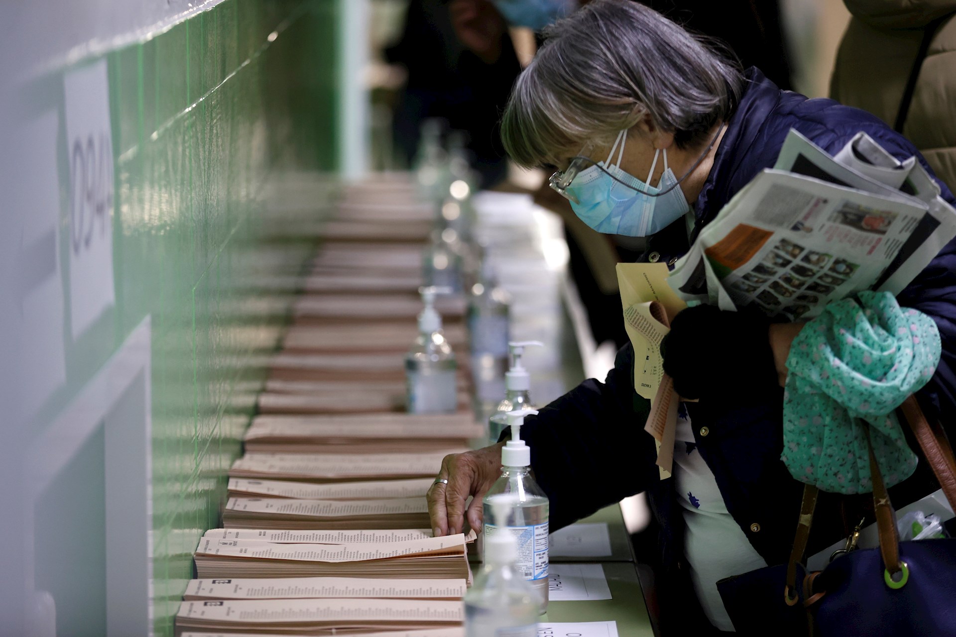 Una mujer ofrece gel hidroalcohólico a los votantes que acceden al colegio Roma de Madrid durante la jornada electoral, este martes.