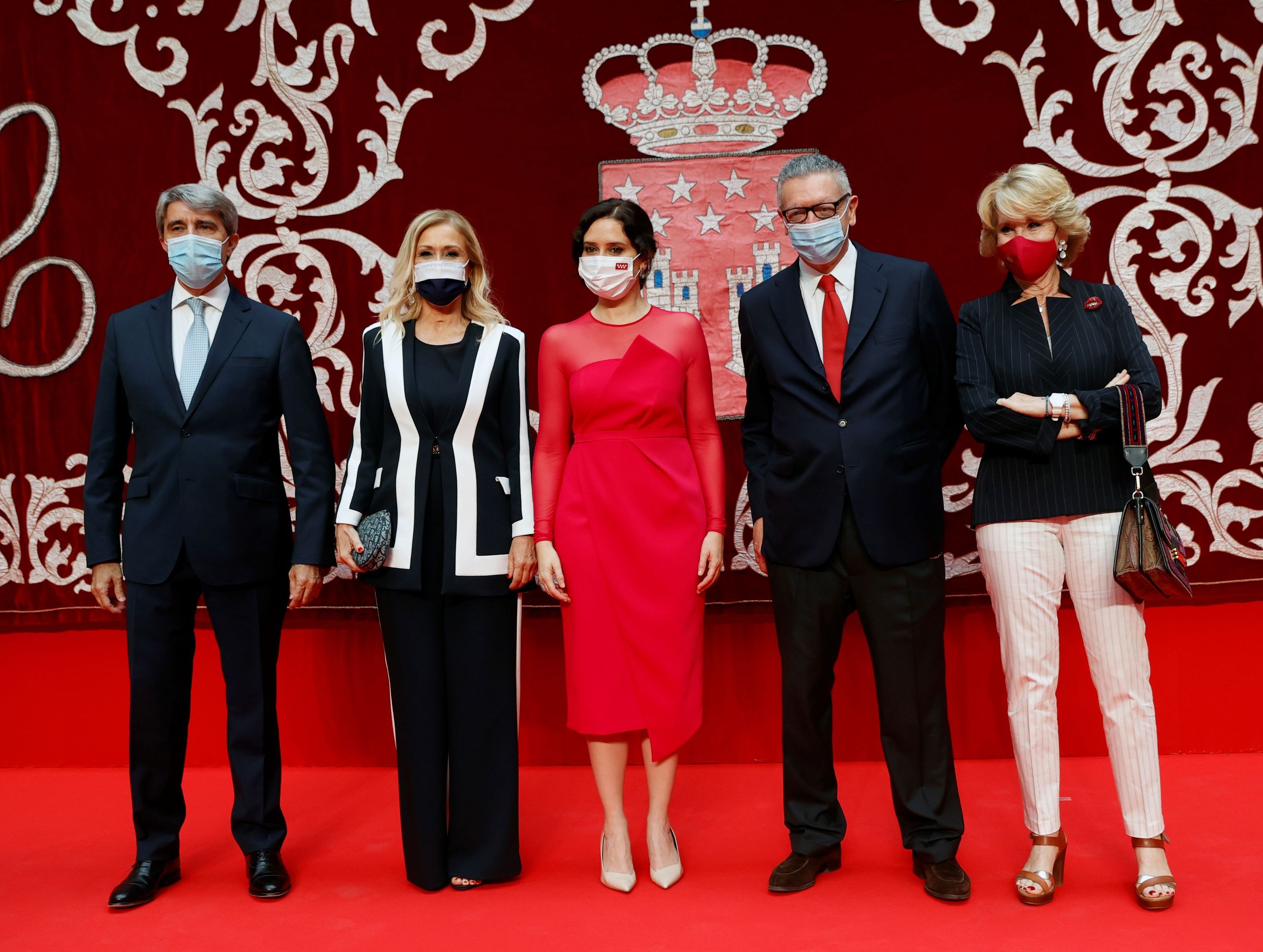 La presidenta de la Comunidad de Madrid, Isabel Díaz Ayuso posa con sus antecesores en el cargo, Ángel Garrido, Cristina Cifuentes, Alberto Ruiz-Gallardon y Esperanza Aguirre tras la investidura de Ayuso celebrada en la Real Casa de Correos.