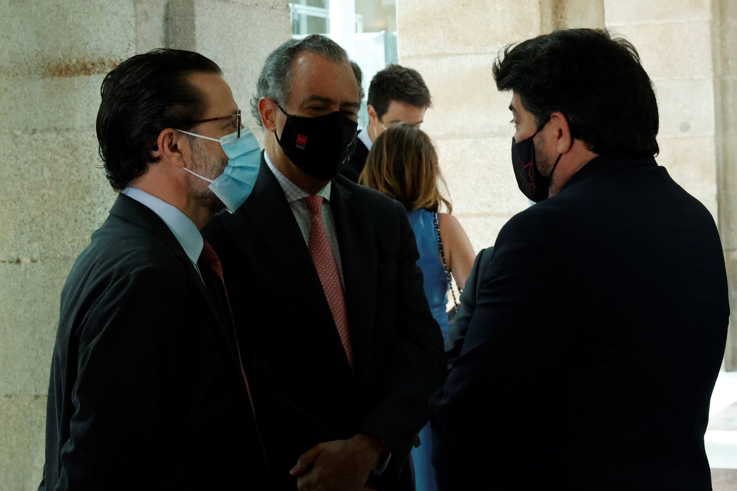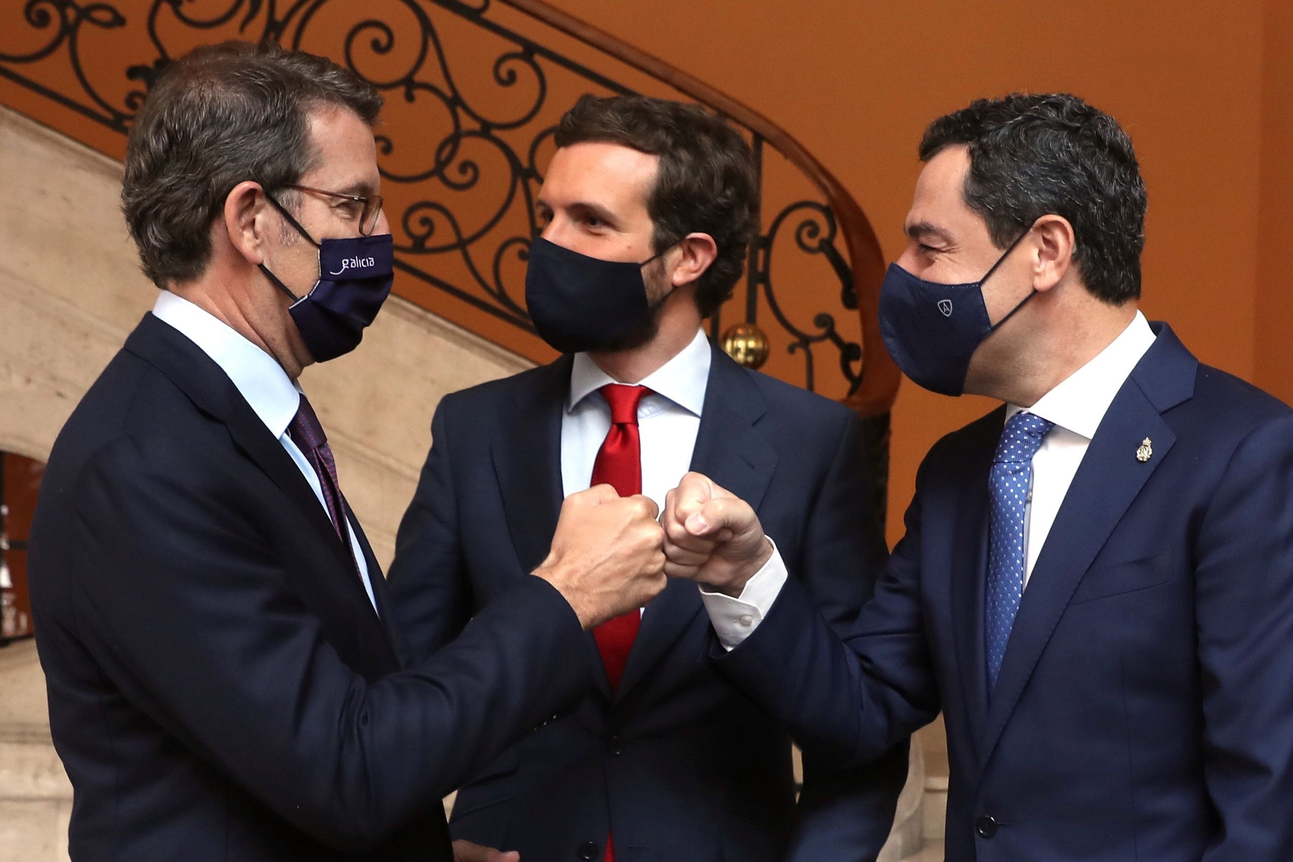 Pablo Casado, Juan Manuel Moreno y Alberto Núñez Feijóo, en la toma de posesión de Isabel Díaz Ayuso.