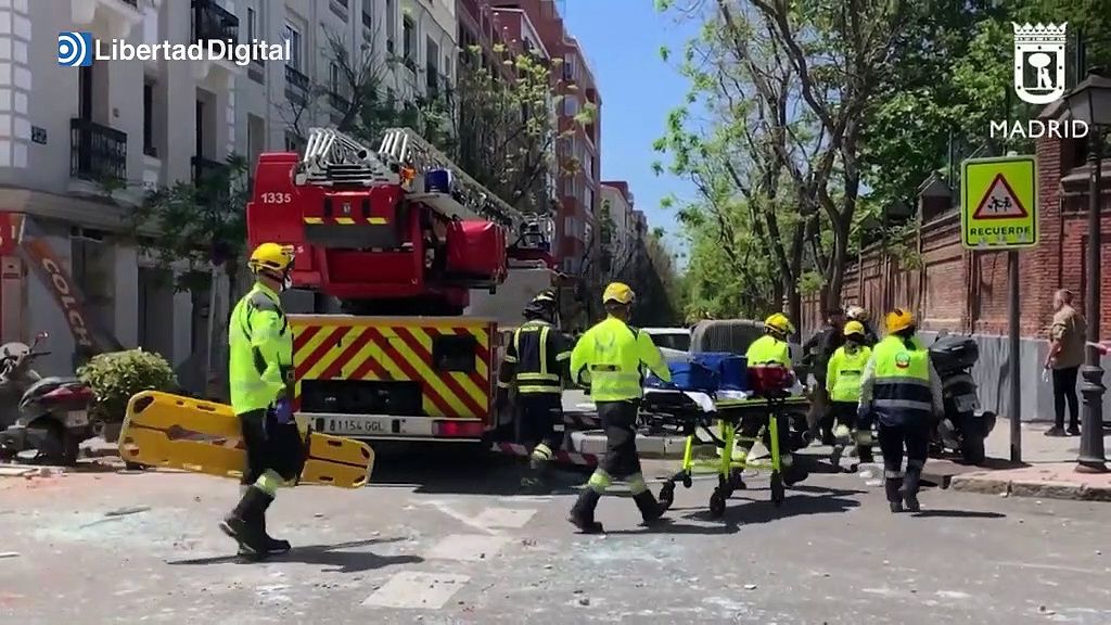 Imágenes de los efectivos de Bomberos de Madrid, del SAMUR-PC y de la Policía Municipal de Madrid, tras la explosión en una vivienda de la calle General Pardiñas, en el barrio de Salamanca (Madrid), del que han resultado 12 personas heridas. El edificio y los coches aparcados en la inmediaciones han quedado dañados por la caída de cascotes.